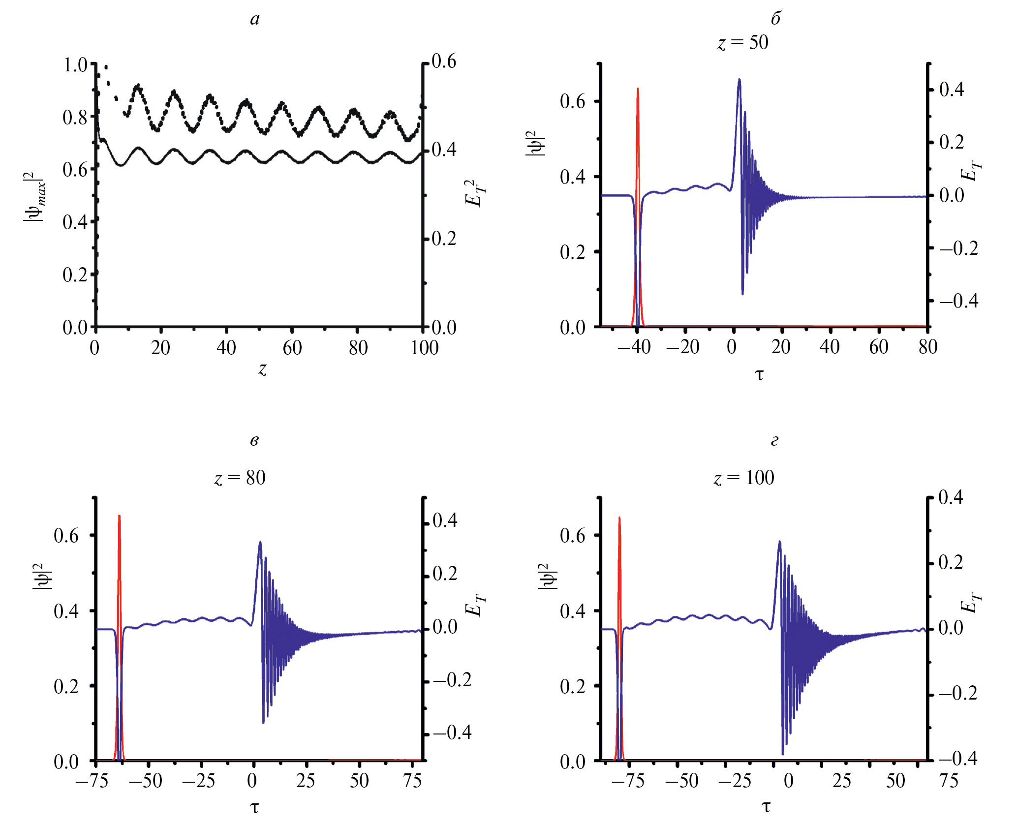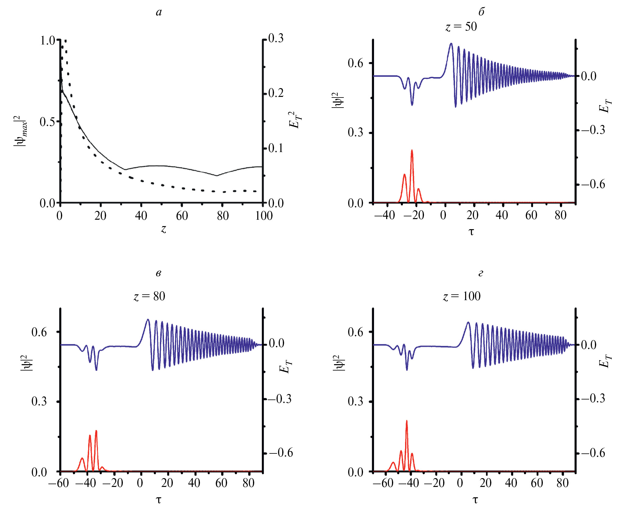 На рис. 4 приведены результаты расчета с параметрами, аналогичными рис. 3, за исключением наличия фокусирующей керровской нелинейности p = –1. Пиковая амплитуда оптического сигнала на рис. 4а сохраняется с расстояния z = 10. Это свидетельствует о том, что к расстоянию в 10 нелинейных длин уже формируется оптико-терагерцовый солитон, распространение которого прослежено до ста нелинейных длин (см. рис. 4б и 4в). Справа от этого солитона можно видеть оторвавшийся от солитона терагерцовый сигнал, постепенно меняющий свой профиль.