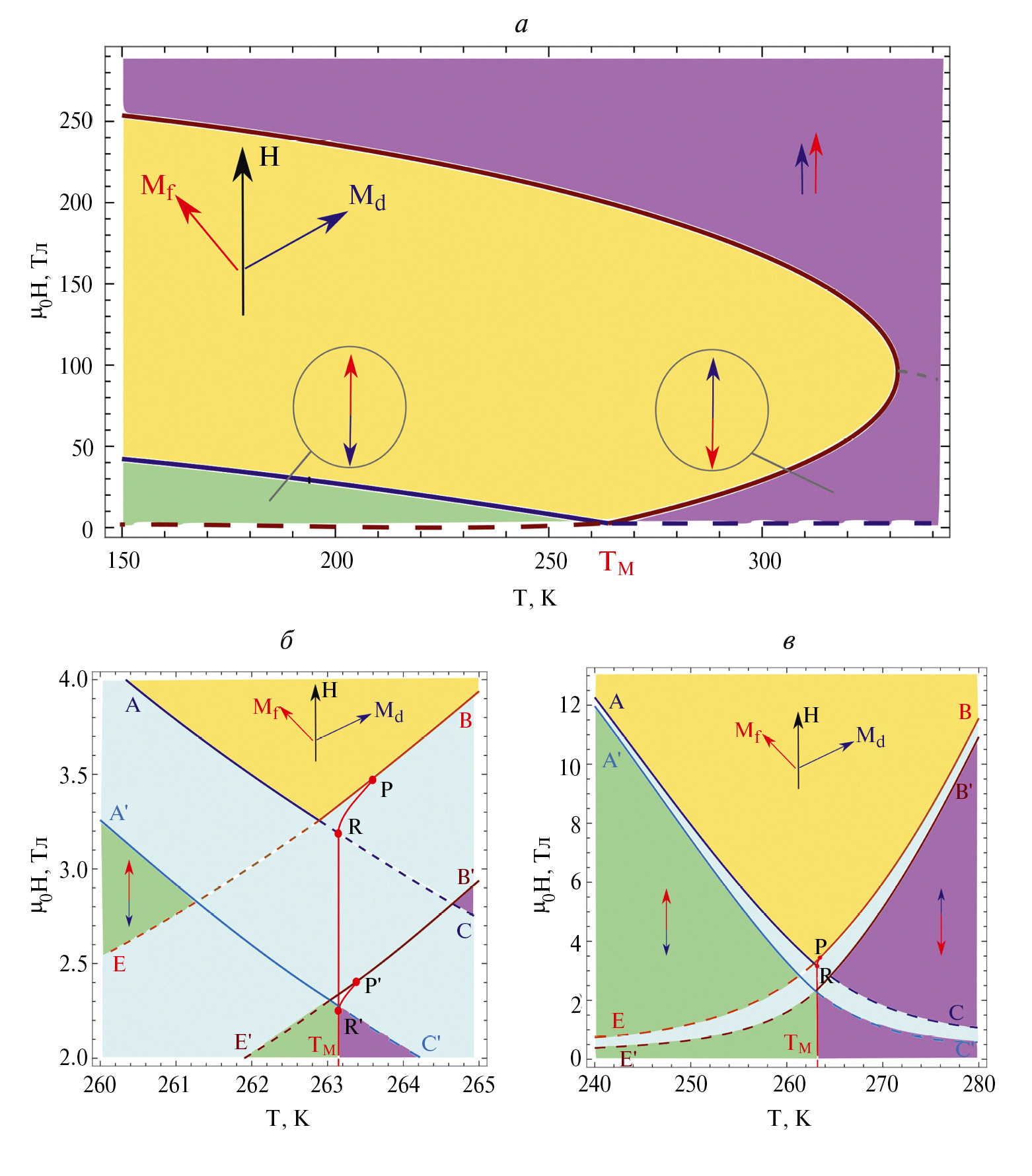 Рис. 1. Фазовая H-T диаграмма ферримагнетика в магнитном поле, приложенном вдоль легкой оси в широком диапазоне полей; сплошные линии и штриховые линии обозначают фазовый переход второго рода между коллинеарной и угловой фазами и фазовый переход второго рода между коллинеарными фазами соответственно (а). Увеличенная фазовая диаграмма вблизи трикритических точек Р и Р'; прямая TMR'P' показывает фазовый переход первого рода между коллинеарными фазами, кривые RP и R'P' показывают фазовый переход первого рода между угловой и коллинеарной фазами (б). Уменьшенная фазовая диаграмма вблизи температуры компенсации намагничивания TM (в). AC и BE – линии потери устойчивости в условии отсутствия поверхностной анизотропии; A'C' и B'E' – линии потери устойчивости при наличии анизотропии поверхности. Все диаграммы построены для .