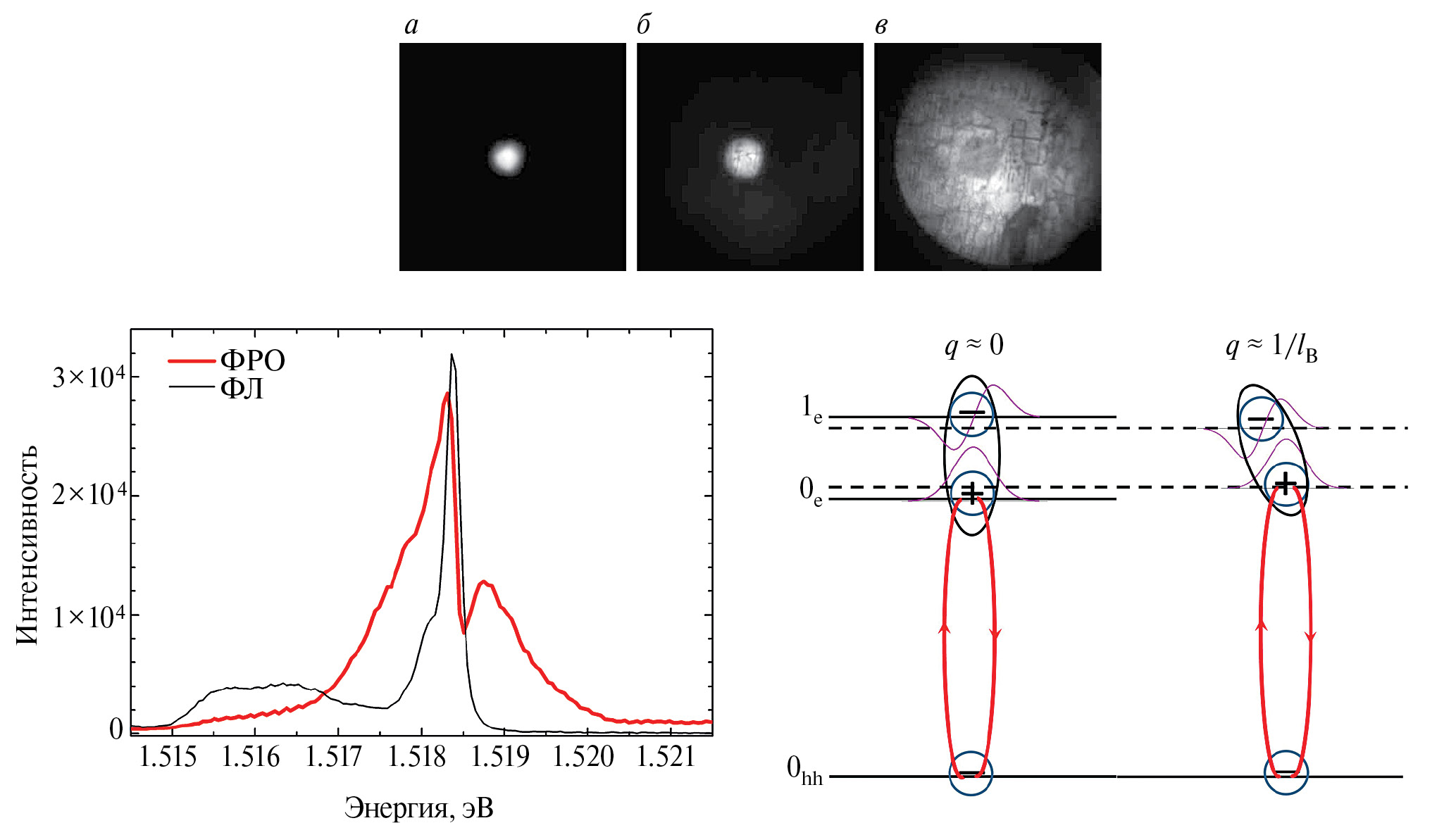 Рис. 1. Изображения образца целочисленного квантово-холловского диэлектрика (ν = 2) в свете ФЛ (а) и в свете ФРО на длинах волн λmax (б) и λ2 ≈ λmax – 0.2 нм (в). Ppump = 10 мкВт. T ≈ 0.55 К. Размер стороны кадра ≈310 мкм. Внизу приведены спектры ФЛ и ФРО, зарегистрированные при близких условиях эксперимента. Диаграмма внизу справа иллюстрирует волновые функции и уровни энергии для ТЦМЭ с обобщенными импульсами q ≈ 0 и q ≈ 1 / lB. Красными линиями показаны соответствующие оптические переходы ФРО