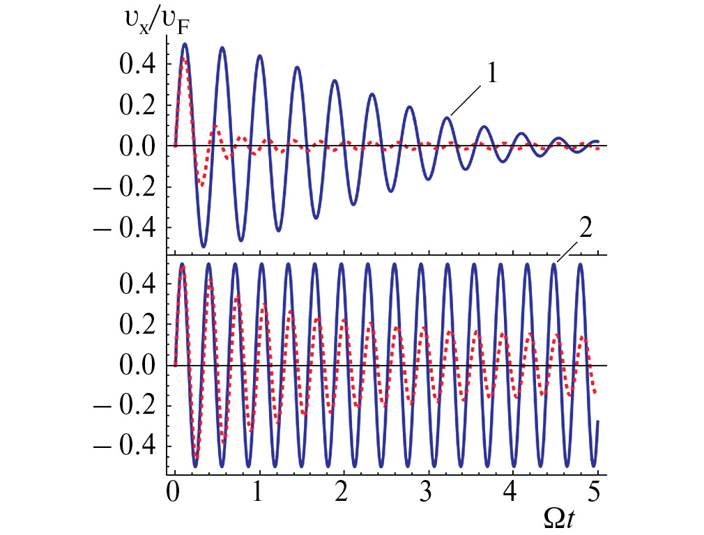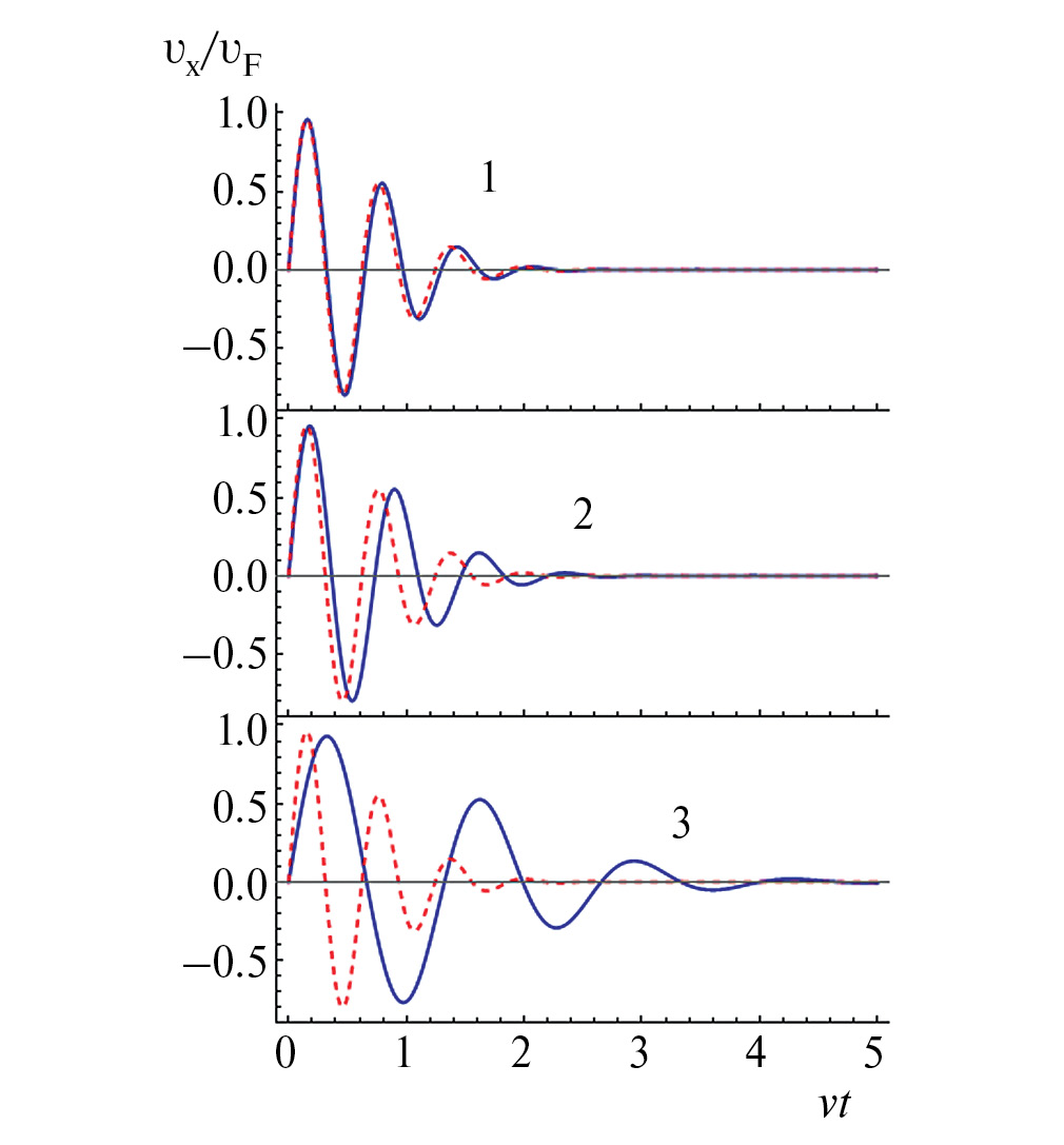 где , ν = τ–1. На рис. 1 представлены осцилляции групповой скорости при различных значениях амплитуды ВЧ поля, построенные по формуле (9). Видно, что с ростом амплитуды время затухания увеличивается. Здесь и далее для численного анализа используются значения параметров p и b из [10]: p = 1.2 мкм–1, b = 4 мкм. На графиках отсутствуют дополнительные гармоники осцилляций, которые предсказывались в [10], т.к. результат получен с использованием усредненного по ним гамильтониана . Однако продолжительность осцилляций и ее увеличение с ростом амплитуды совпадают по порядку величины с результатами [10]. Последнее говорит о правомерности используемого аналитического подхода с целью анализа зависимости продолжительности ZB от интенсивности ВЧ поля.