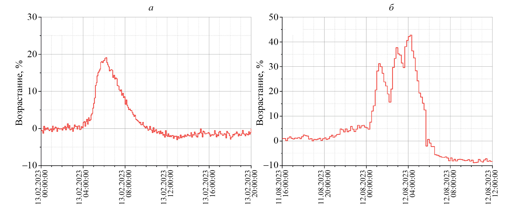 Рис. 1. Профили событий возрастания потока ЭМК во время осадков на станциях: Нейтрино, 13.02.2023 (а); Тацинская, 12.08.2023 (б). Стоит обратить внимание на даты по оси ОХ. Для Нейтрино возрастание произошло в холодный сезон, когда осадки выпадают в виде снега и наличествует глубокий снежный покров. Несколько локальных максимумов на профиле в станции Тацинская соответствуют усилениям интенсивности дождя. Использованы пятиминутные данные каналов >100 кэВ