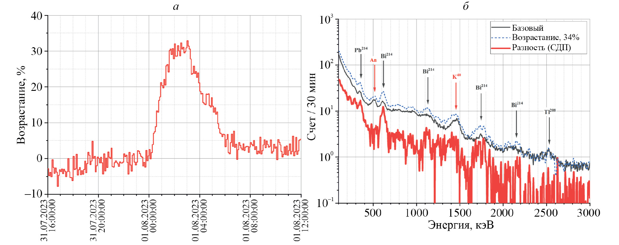 На рис. 2 представлены спектры для события возрастания в Апатитах 01.08.2023. В процессе создания методики обработки спектров использовано следующее положение. Возрастание представляется как добавление к потоку ЭМК, существовавшему до возрастания, т.е. как дополнительный поток. В общем случае — со своим спектром, в котором могут присутствовать и линии радионуклидов. Поскольку спектры дифференциальные, то для получения спектра только дополнительного потока (СДП) необходимо из спектра, измеренного при возрастании, вычесть спектр, полученный перед возрастанием. Одиночный спектр имеет существенные флуктуации, поэтому, по возможности, берется интервал в несколько часов и вычисляется средний спектр. Например (см. рис. 2а), перед возрастанием поток был стабильным с 19 UT до полуночи 31.07.2023, спектры за этот интервал использованы для получения среднего спектра, названного базовым: это спектр ЭМК перед возрастанием. Возрастание держалось на максимуме с примерно постоянным потоком с 01:30 до 03:00 UT 01.08.2023. За этот промежуток имеются три получасовых спектра, они использованы для вычисления среднего спектра возрастания. Разность спектров возрастания и базового дает СДП, т.е. излучение, которое добавилось к основному потоку ЭМК.