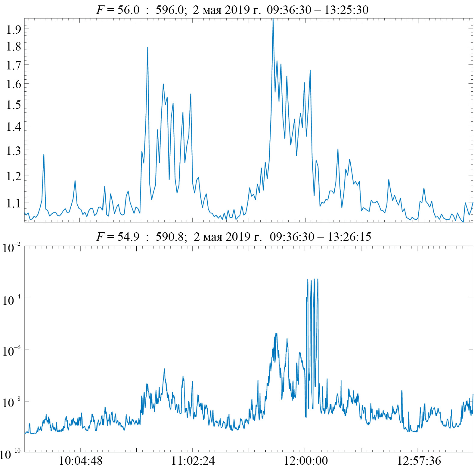 Рис. 1. Одновременные измерения средней мощности излучения (усреднение по частотам F): от 56 до 596 кГц для WIND c шагом 60 с, от 54.9 до 596 кГц для ERG с шагом 8 с. Измерения выполнены 02.05.2019 на двух спутниках: с 9:36 до 13:26, на борту спутника WIND (верхняя панель) и на борту спутника ERG (нижняя панель)