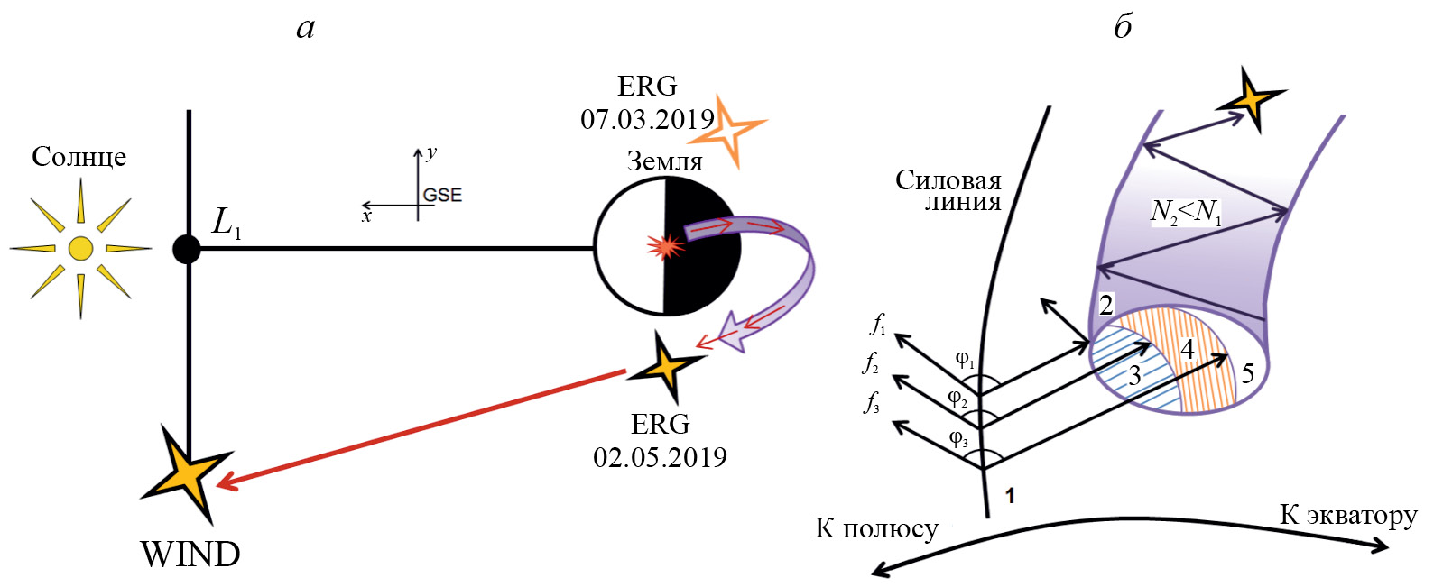 Рис. 2. Схема взаимного расположения источника АКР и спутников ERG и WIND во время измерений 07.03.2019 и 02.05.2019 (а). Представлен вид на плоскость эклиптики со стороны (–ZGSE). 07.03.2019 координаты для спутника ERG: X = –0.6; Y = 3.3; Z = 0.4; для спутника WIND: X = 256; Y = –42; Z = 8.8 (в системе GSE, в единицах RE). 02.05.2019 координаты для спутника ERG: X = –3.3; Y = –1.7; Z = 0.6; для спутника WIND: X = 205; Y = –71; Z = 1.5. Схема захвата излучения в плазменный канал (б): 1 — силовая линия, на которой расположен источник АКР; 2 — канал плазмы, вытянутый вдоль силовой линии магнитного поля; 3 — область засветки торца канала для частот f1 ≤ f ≤ f2; 4 — область засветки для частот f2 ≤ f ≤ f3; 5 — область засветки для частот более f3; f1, f2, f3 — частоты АКР, где f1 > f2 > f3; — раствор конуса излучения АКР; N1 — плотность плазмы вне канала; N2 — плотность плазмы в канале. Стрелками показано распространение излучения из источника и в канале