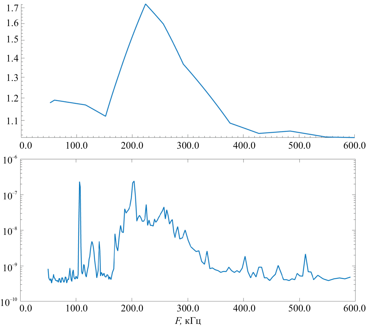 На рис. 3 представлены спектры АКР, зарегистрированные одновременно на двух спутниках 07.03.2019 в 17:00:30 UT. Оба спектра подобны: быстрое нарастание спектральных составляющих на низких частотах, затем максимум и относительно медленное уменьшение интенсивности с повышением частоты. Наряду с подобием спектров наблюдается и их отличие: частота максимума на спектре, зарегистрированном на спутнике WIND, составляет 230 кГц, а на спутнике ERG — 200 кГц. Однако на высоких частотах интенсивность излучения спадает примерно по одинаковому закону на обоих спутниках (WIND и ERG). Заметим, что при изменении частоты от 200 до 400 кГц амплитуда спектральных составляющих уменьшается, приблизительно, на два порядка.