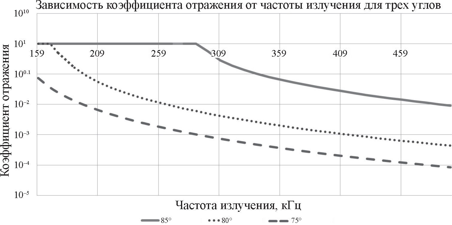 Рис. 4. Результаты расчета коэффициентов отражения от стенки канала (для случая (N1 – N2) / N1 = 0.67) для трех углов: 85° (сплошная линия), 80° (точечная линия), 75° (пунктирная линия)
