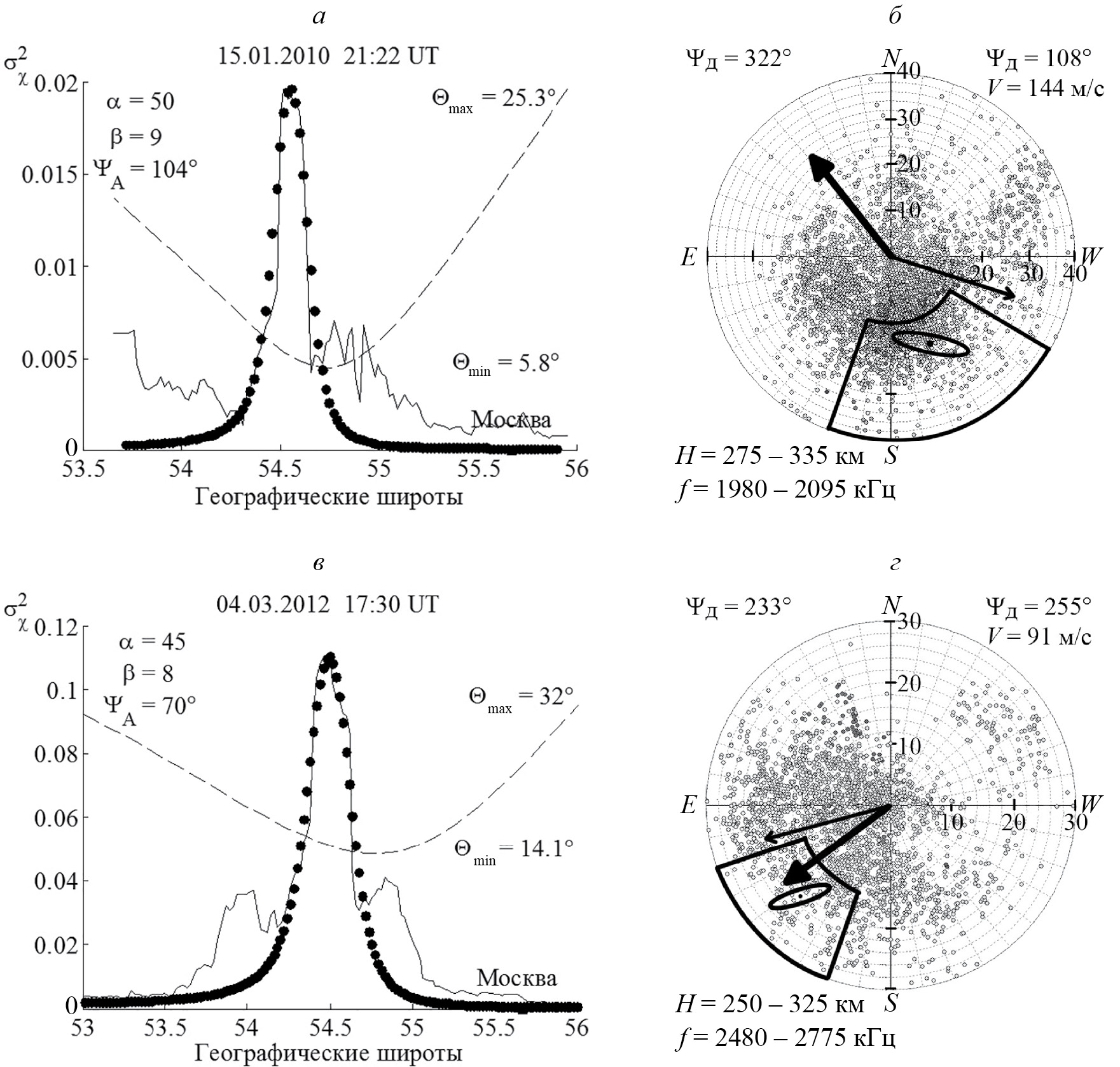 На рис. 1а и 1в приведены два примера аппроксимации одного максимума, в несколько раз превышающего уровень фона, в широтных профилях дисперсии логарифма относительной амплитуды σχ2. В радиосеансе 15 января 2010 г. при Кр = 2+ (см. рис. 1а) флуктуации рассеянного на неоднородностях радиосигнала наблюдались между 54.3° с.ш. и 55.3° с.ш. В радиосеансе 4 марта 2012 г. при Кр = 2– (см. рис. 1в) неоднородности были обнаружены между 53.5° с.ш. и 55.1° с.ш. Согласно модели трехмерно-анизотропных неоднородностей при 2° < Θmin < 20° ширина теоретического максимума определяется в основном вытянутостью неоднородностей вдоль α и перпендикулярно β к магнитному полю, а широтное положение максимума главным образом зависит от ориентации поперечной анизотропии ΨА. Параметры анизотропии α, β и ΨА, с которыми достигается наилучшая аппроксимация, приведены в левом верхнем углу каждого рисунка. Эти параметры считаются постоянными в широтно-долготной области, занимаемой максимумом. Пунктиром показан график значений углов между перемещающимся спутником и магнитным полем в точке наблюдения с указанием минимального (Θmin) и максимального (Θmax) значений. В работе [13] наглядно показано, что доверительный интервал величины ΨА составляет несколько градусов, если спутниковый пролет не является зенитным, т.е. Θmin > 2°. В рассматриваемых спутниковых сеансах это выполняется, что позволяет численно сопоставить ориентацию поперечной анизотропии ΨА с одновременным направлением дрейфа среднемасштабных неоднородностей.