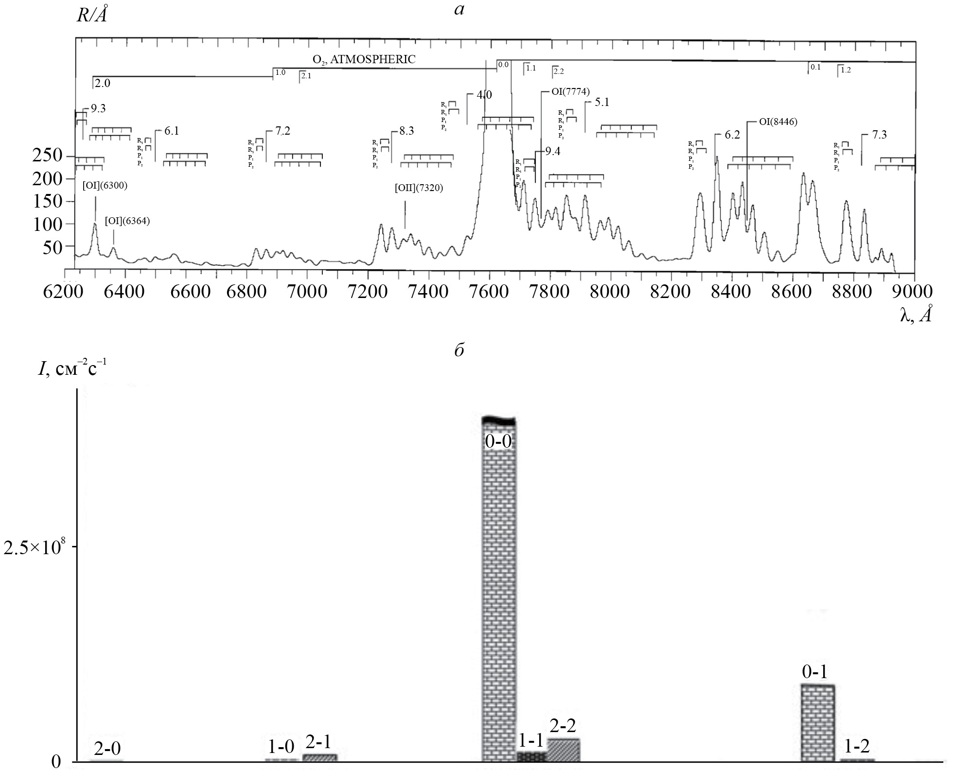 где vʹ — колебательные уровни b1Σg+ состояния; vʺ — колебательные уровни основного X3Σg– состояния. Данная система полос регистрируется в инфракрасных спектрах свечения ночного неба в атмосфере Земли [1]. Необходимо подчеркнуть, что ночное и даже сумеречное ее излучение обладает весьма малой интенсивностью по сравнению с привычным окружающим дневным освещением. Это ставит достаточно высокие требования к выбору спектральной аппаратуры и необходимой ее чувствительности [1].