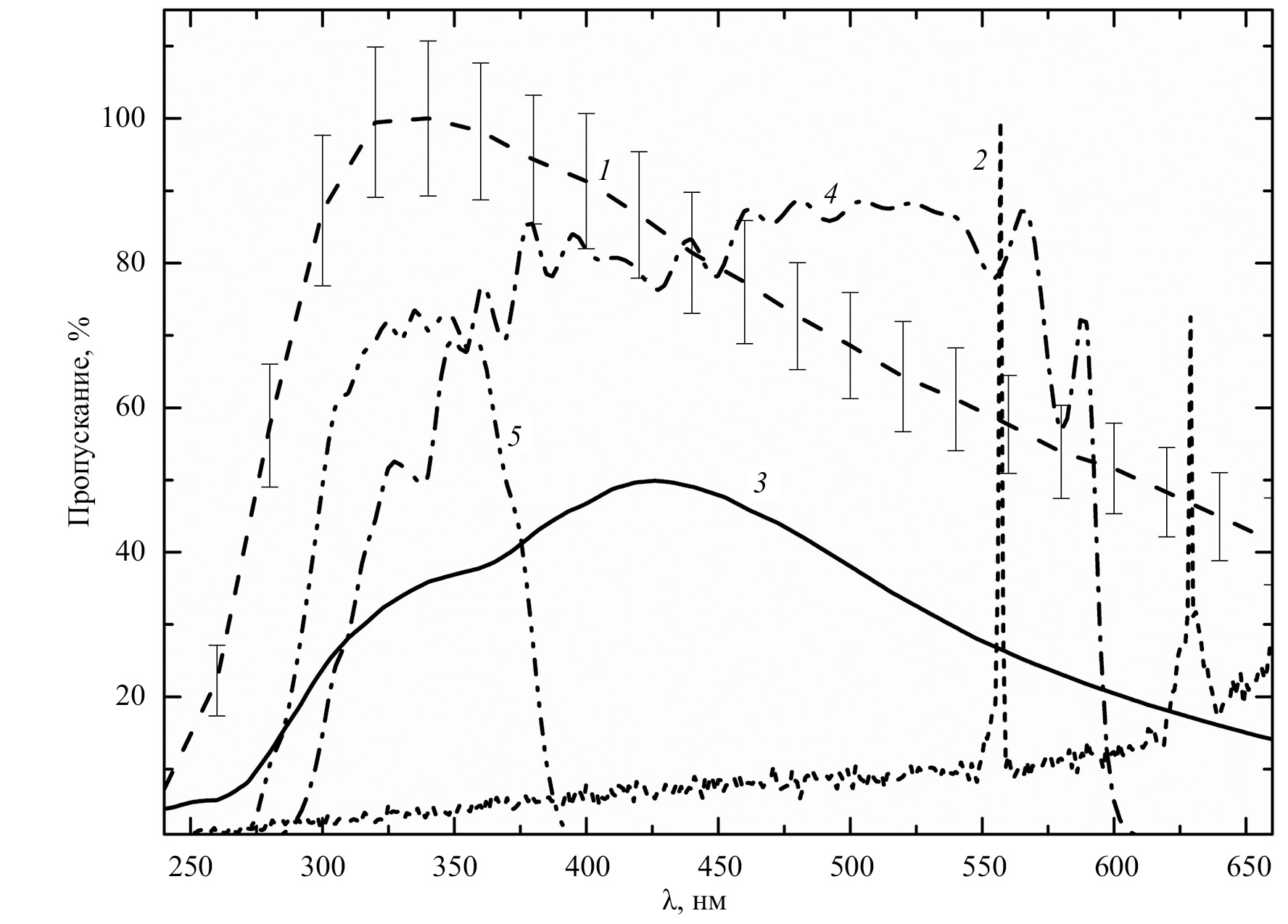 Рис. 1. Зависимости профилей от длины волны: 1 — средний спектр черенковского излучения от ШАЛ, вызванного гамма-квантом с энергией 1 ТэВ, нормированный на 100% в максимуме на длине волны ≈330 нм (кривая из длинных штрихов); 2 — пример конкретной реализации спектра фона ночного неба (нормированного на 100% в максимуме на длине волны ≈557 нм), смоделированного методом Монте-Карло (кривая из коротких штрихов); 3 — эффективность детектирования фотонов SiPM OnSemi MicroFJ-60035 (сплошная кривая); 4 — коэффициент пропускания фильтра SL 290-590 (штрихпунктирная кривая); 5 — коэффициент пропускания фильтра SL 280-390 (кривая штрих с двумя точками)
