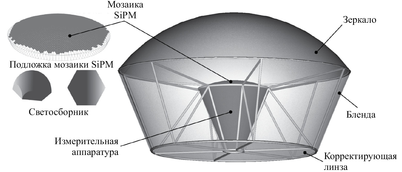 В настоящее время рассматривается вариант конструкции установки с чувствительной площадью входного окна диафрагмы более 1 м2, диаметром зеркала — до 2200 мм, углом обзора — до 22°, количеством SiPM в детекторе — до 3000 (рис. 3). Для регистрации прямого черенковского света предполагается предусмотреть объектив в верхней части зеркала. Измерительная аппаратура будет расположена в конусе тени мозаики. Установка без аккумуляторов будет весить до 100 кг.
