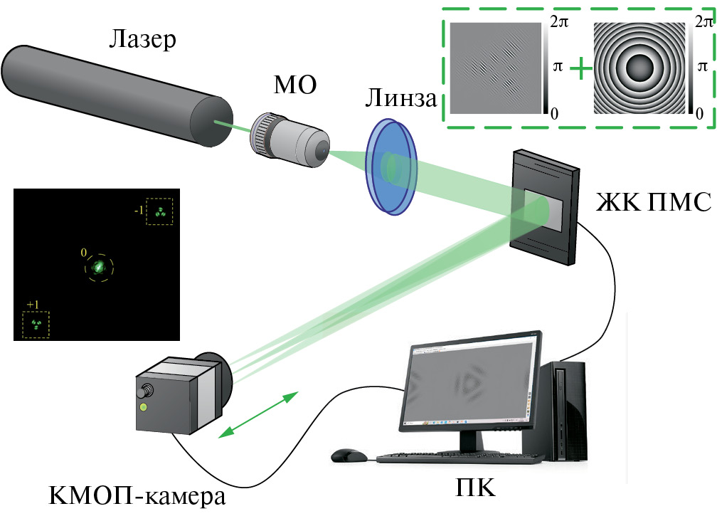 Для экспериментальной проверки выполнения установленной закономерности местоположения плоскости автофокусировки три-Эйри пучков была создана экспериментальная установка. Схема экспериментальной установки приведена на рис. 3. В качестве источника когерентного излучения выступает твердотельный лазер с диодной накачкой на длине волны λ = 532 нм и максимальной мощностью Pmax = 50 мВт. Пучок лазера коллимируется при помощи микрообъектива и линзы и попадает на фазовый жидкокристаллический пространственный модулятор света (ЖК ПМС) HoloEye HEO 1080P (разрешение 1920 × 1080 пк., размер пикселя 8 мкм, режим работы: отражение, глубина модуляции фазы: 2π). Далее происходит дифракция на структуре, сформированной на ЖК ПМС, и происходит регистрация сформированных три-Эйри пучков на различных расстояниях от плоскости фокусировки вписанной линзы (Фурье плоскости).