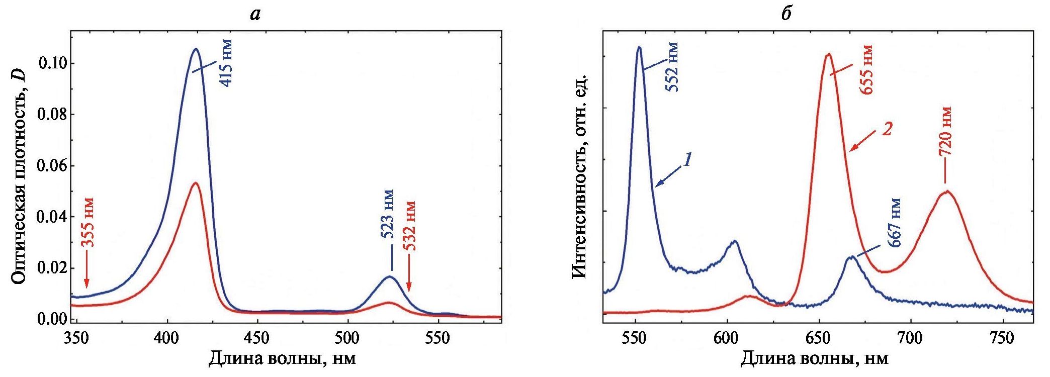 Для выяснения причин такого эффекта, по-видимому, потребуется выполнить ряд дополнительных исследований. Известно, что при лазерном фотолизе импульсное излучение лазера переводит молекулы в основное триплетное состояние и одновременно проводится облучение образца широкополосным зондирующим непрерывным излучением. При этом проводится анализ наведенного поглощения в области триплет-триплетного поглощения в области около 470 нм [20]. Предварительно можно предположить, что при возбуждении в области видимых полос поглощения (λвозб = 536 нм, частота 18 650 см−1) заселяется только первое возбужденное синглетное, а затем и в триплетное состояние. При возбуждении образцов в области полосы Соре (λвозб = 382 нм, 26 180 см−1) молекулы переводится в высокорасположенные электронные состояния (полоса Соре). Затем молекулы релаксируют в нижнее триплетное состояние, длительность жизни которого даже при атмосферной концентрации молекулярного кислорода составляет не менее 200 нс (см. табл. 2). Как было указано выше, максимум полосы триплет-триплетного поглощения для исследованных молекул расположен около 470 нм (частота 21 280 см–1). Длительность импульса лазера на красителе составляет около 10 нс с частотой 26 180 см−1, что существенно выше энергетического зазора триплет-триплетного перехода. При этих условиях появляется вероятность за время жизни фосфоресценции реализовать триплет-триплетное поглощение, что удлиняет время жизни триплетного состояния. При использовании лазерного импульса с λвозб = 536 нм (18 650 см–1) аналогичная ситуация с триплет-триплетным поглощением маловероятна, так как необходимо излучение как минимум с частотой 21 280 см–1.