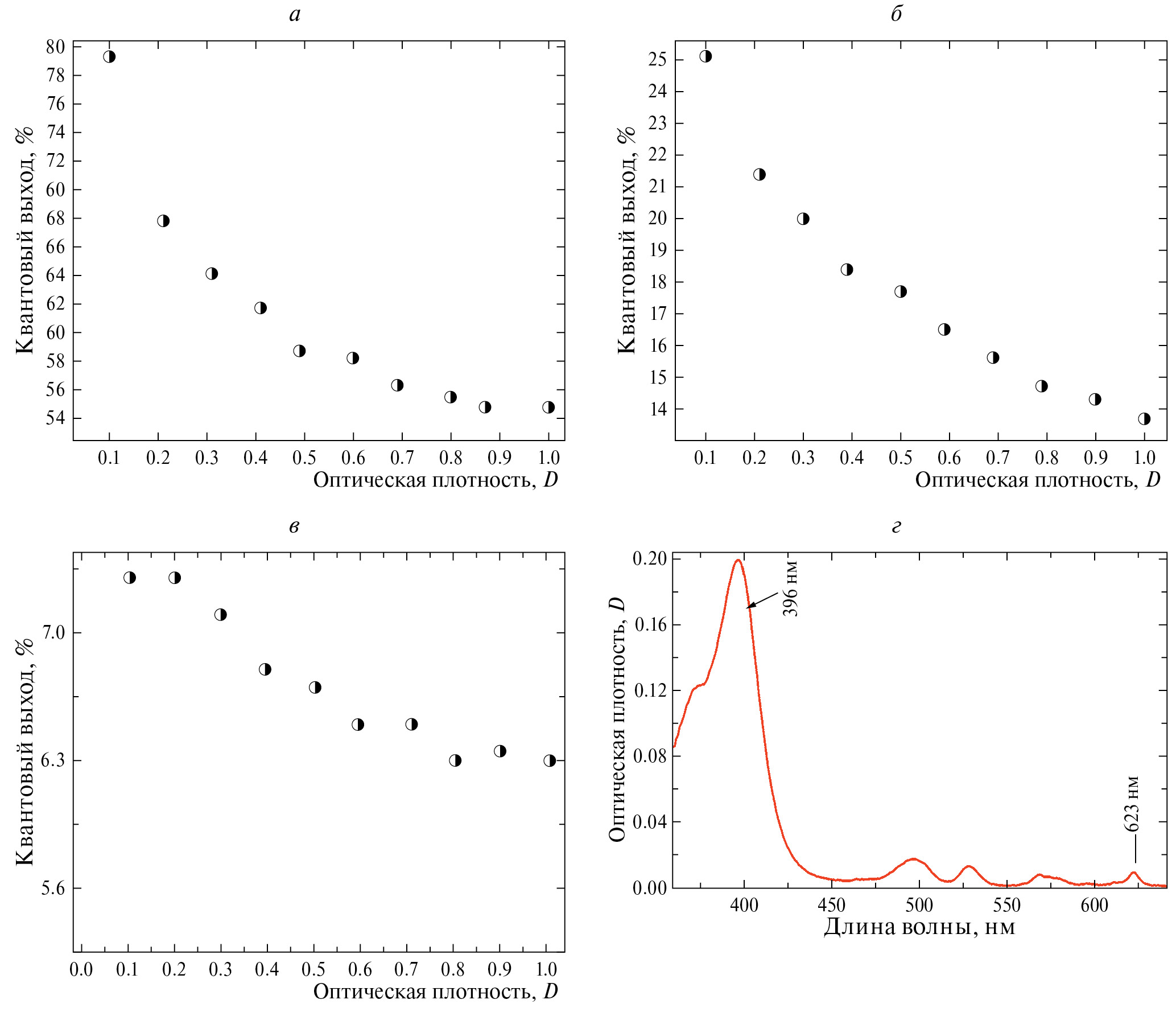 Для Н2-ОЕР (структура на рис. 1в) были выполнены аналогичные измерения АКВ и результаты приведены на рис. 3в. На рис. 4г приведен спектр поглощения Н2-ОЕР в ТГФ. Спектр поглощения Н2-ОЕР состоит из интенсивной полосы поглощения около 396 нм, которая на представленном рисунке имеет оптическую плотность около 0.2 и полосы 0—0 перехода в области 623 нм, оптическая плотность составляет только 0.01. Длинноволновая полоса поглощения в спектре Н2-ОЕР практически на два порядка имеет меньший коэффициент экстинкции (ε = 5·103 см-1/M), чем для Mg-ТАР (экстинкция ε = 105 см-1/M). Результаты, изображенные на рис. 4в демонстрируют практическое отсутствие зависимости АКВ от оптической плотности на длине волны возбуждения. При оптической плотности 0.1 спектре Н2-ОЕР в ТГФ (λвозб = 397 нм) АКВ имеет величину 7.2%, а при очень сильном повышении оптической плотности до 0.8 АКВ незначительно уменьшается до 6.3% (уменьшение на 10%). Низкая оптической плотность полосы 0—0 перехода в спектре поглощения нивелирует влияние реабсорбции, и небольшая зависимость величины АКВ от оптической плотности объясняется проявлением влияния ПЭВФ.