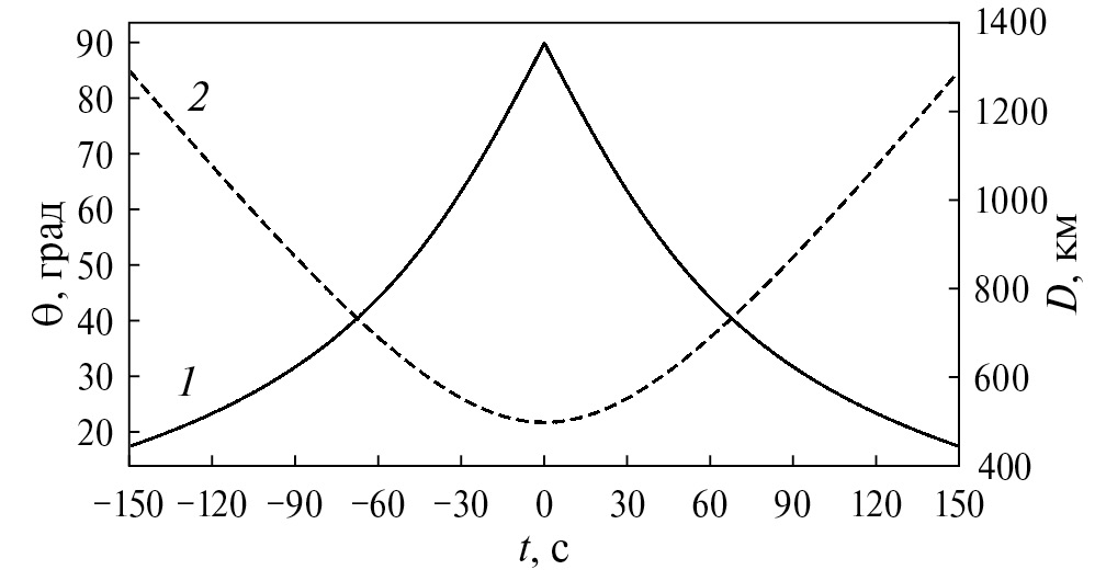 На рис. 1 показаны зависимости угла места спутника и расстояния до него от времени, полученные для зенитного прохода. Результаты представлены для того времени, когда спутник находился в поле зрения наземной станции, т. е. когда угол возвышения над горизонтом составлял свыше 20°.