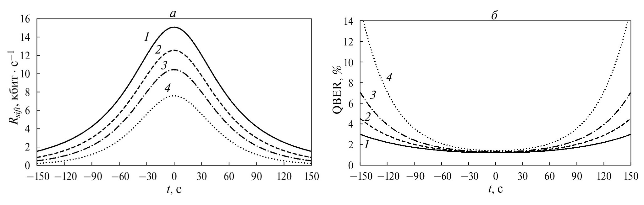 Рис. 3. Скорость генерации просеянного ключа (а) и коэффициент квантовых битовых ошибок (б) в случае отличных погодных условий (1, сплошная кривая), хороших (2, штриховая кривая), средних (3, штрихпунктирная кривая), плохих (4, пунктирная кривая)