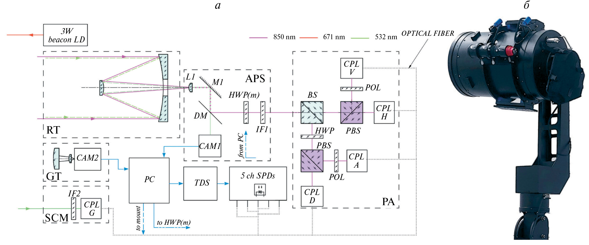 Рис. 4. Наземная оптическая станция [11]: оптическая схема (а) и внешний вид (б)
