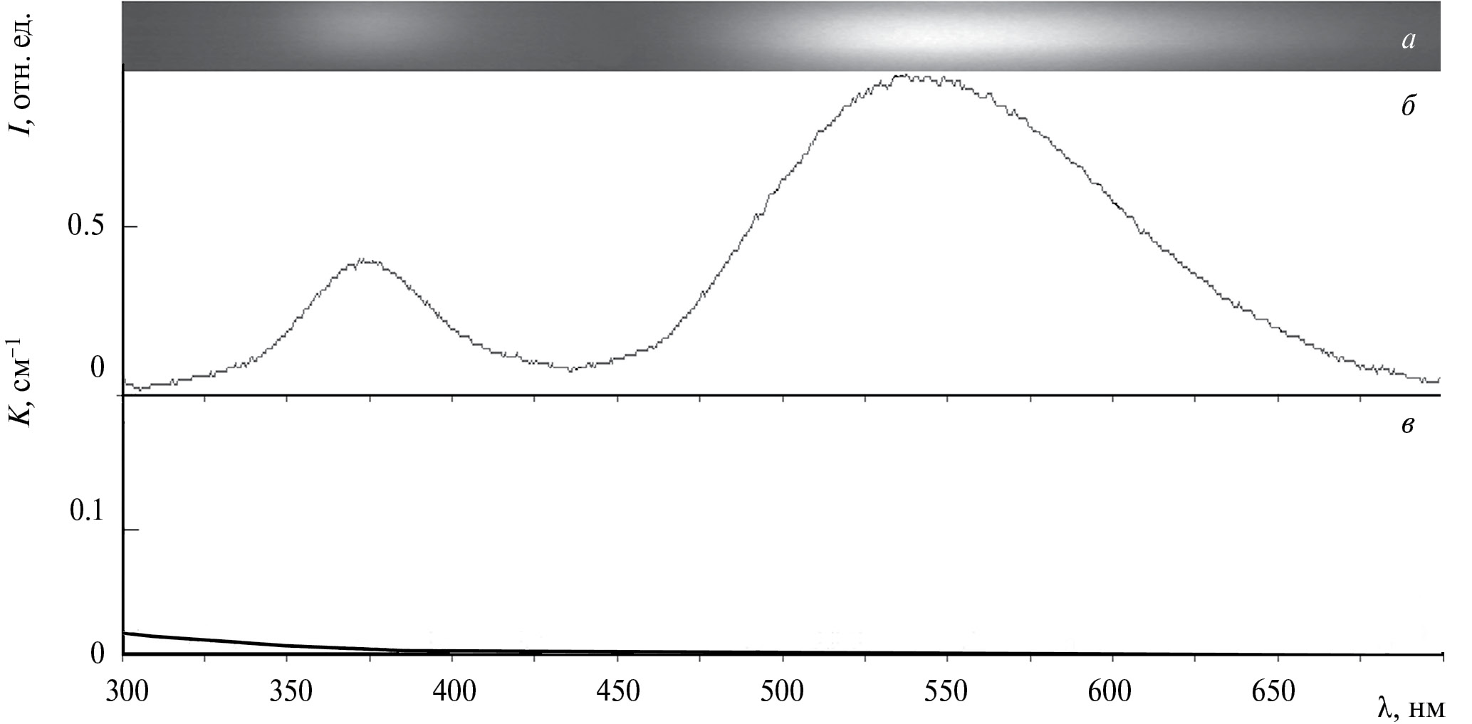 Рис. 1. Спектрограмма (а) и одноимпульсный спектр ФЛ Ce3+ и валентной 2pO2– ФЛ в номинальной чистоты кристаллах Y3Al5O12 при 300 K (б). Возбуждение 2ω: Ti: Sp лазера: λ = 390 нм; 50 фс; 0.1 ГВт·см–2. Регистрация: задержка 5 нс, экспозиция 100 нс. Стационарный спектр оптического поглощения (в).