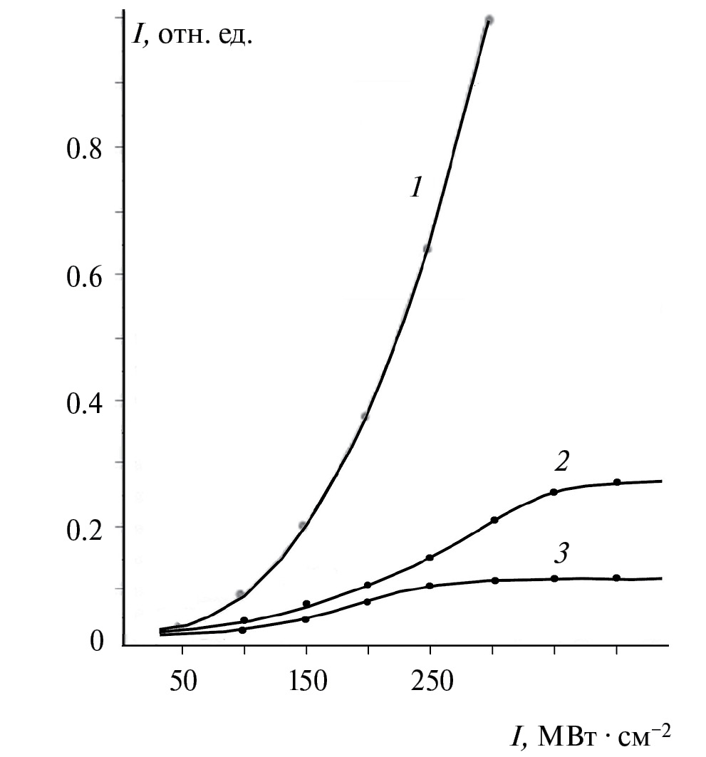 Рис. 4. Зависимость выхода валентной 2pO2– ФЛ в Y3Al5O12 (1) и ФЛ Ce3+ в Y3Al5O12 (2), Се: YAlO3 (3) при 300 K от интенсивности возбуждения излучением 2ω: Ti: Sp лазера: λ = 360 нм, 50 фс. Кристаллы номинальной чистоты.