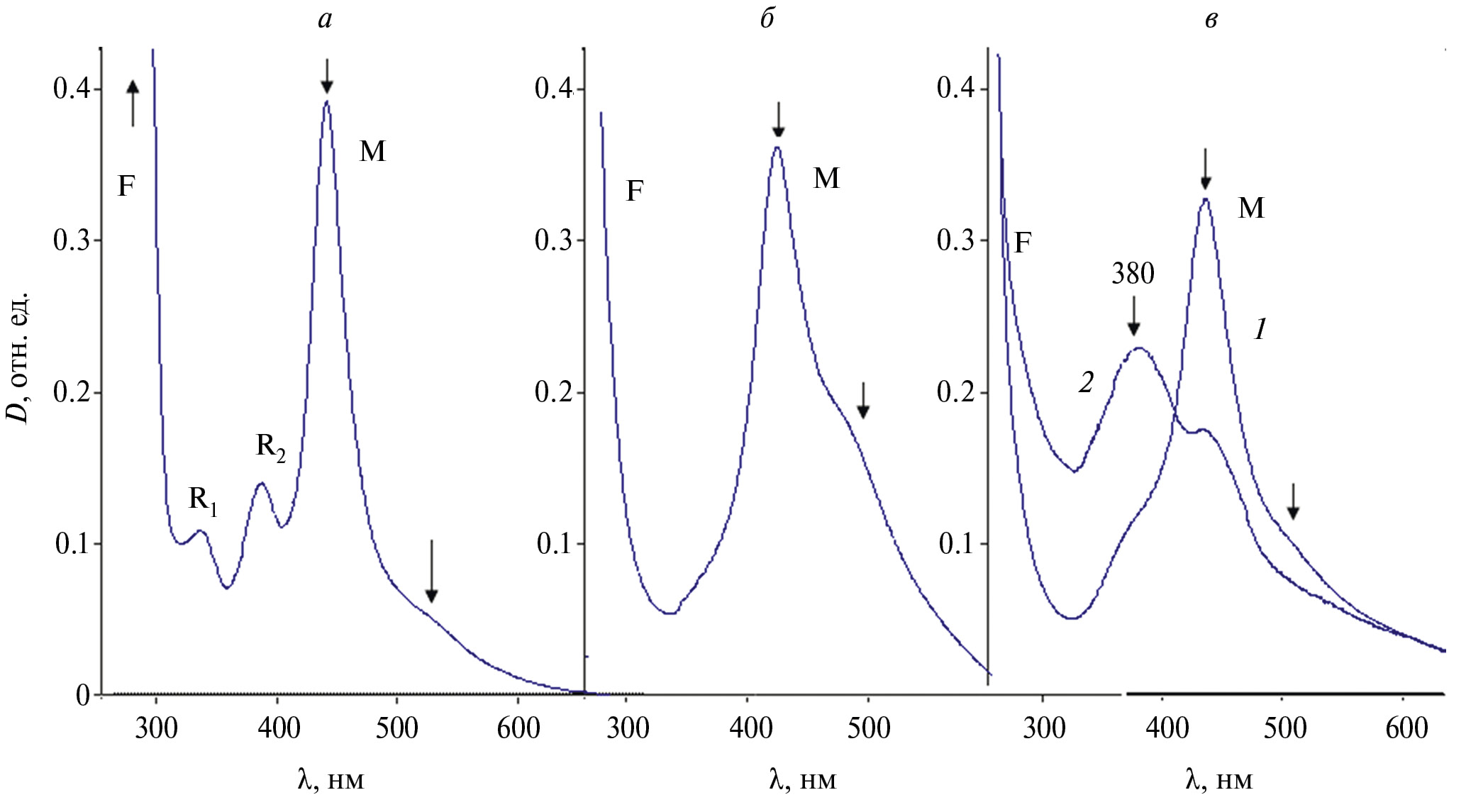Рис. 2. Спектры поглощения центров окраски в кристаллах LiF, облученных гамма-квантами при различных температурах. (а) 300 K, (б) 77 K, (в) 1 — 217—253 К, 2 — 440—580 К. Экспозиционная доза облучения — 5·103 Кл·кг−1.