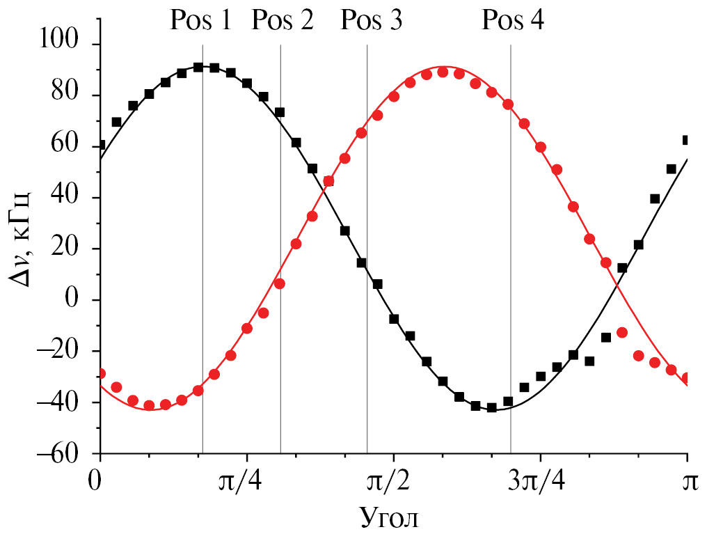 В качестве образца для исследования был использован монокристалл гипса, CaSO4·2H2O. Это хорошо известный диамагнитный кристалл, в котором практически отсутствуют ЯМР-активные изотопы, кроме 1H [21]. Все протоны в структуре эквивалентны и принадлежат двум молекулам воды. Расстояние между протонами внутри одной молекулы воды намного меньше, чем расстояние между различными молекулами воды. Расстояние между протонами в молекуле воды составляет 1.54 Å [22]. Векторы, соединяющие протоны двух молекул воды в структуре, неколлинеарны. Расстояние до ближайших протонов окружающих молекул воды намного больше (~2.7 Å), в результате чего ДДВ внутри пары, принадлежащей одной молекуле воды, наиболее существенно. В общем случае спектр ЯМР содержит четыре пика [21]. При некоторых ориентациях пики могут вырождаться в один центральный пик или совпадать. Кристалл был закреплен внутри стеклянной ампулы. Ориентация осей кристалла относительно внешнего магнитного поля не выбиралась специальным образом. Однако мы выбрали ориентацию, которая позволяла наблюдать большие изменения расщепления между пиками при вращении образца внутри катушки. На рис. 1. показано расщепление между парами пиков в зависимости от угла. Расщепления для двух разных межпротонных векторов показаны разными символами и цветами. Сплошные линии соответствующего цвета представляют подгонку методом наименьших квадратов к ожидаемой угловой зависимости для диполь-дипольного взаимодействия [21]: