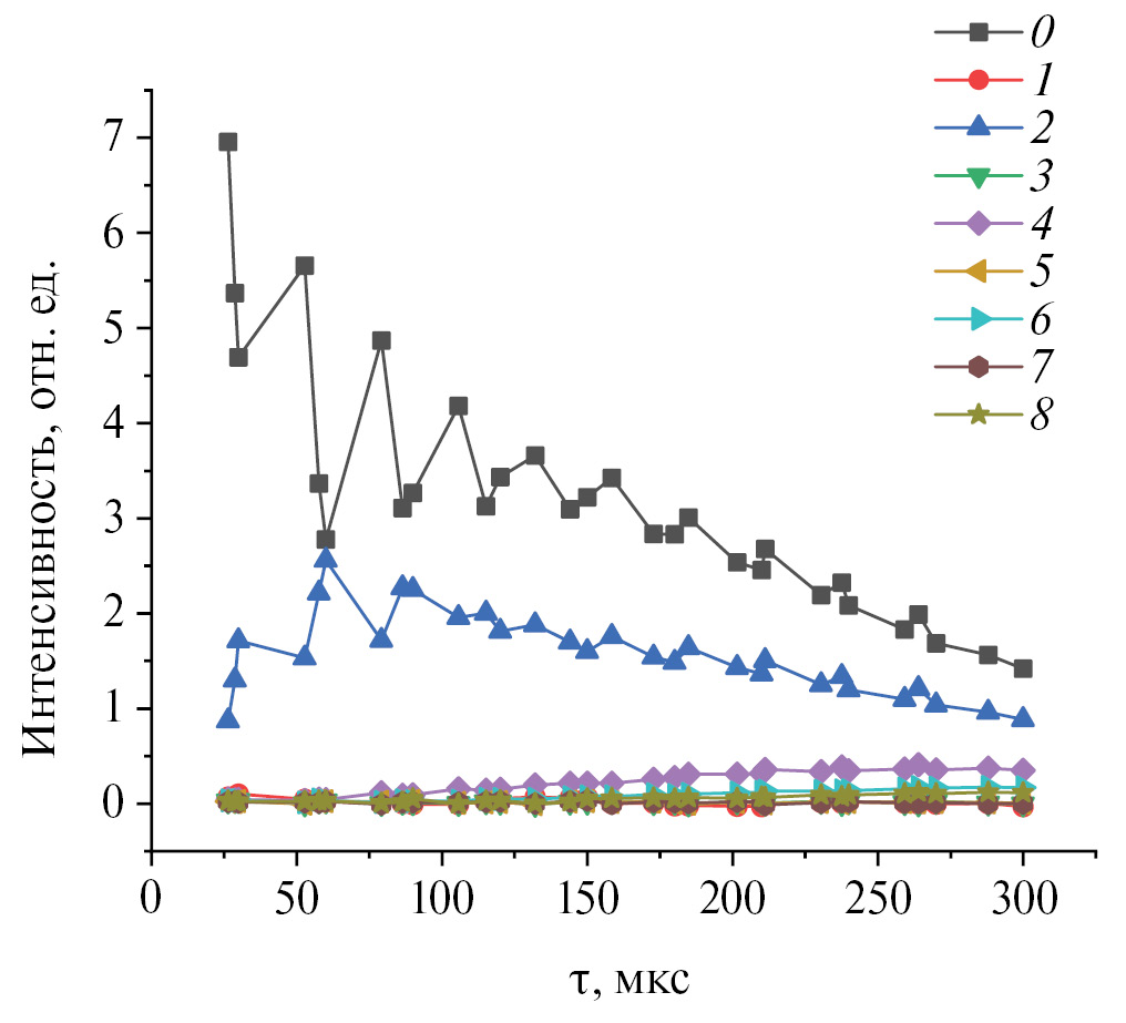 Результат типичного МК-эксперимента ЯМР, полученный в настоящем исследовании, показан на рис. 3 для внешнего дублета Pos3. Показаны интенсивности только неотрицательных порядков когерентности в зависимости от времени подготовки, поскольку интенсивности когерентностей, отличающихся только знаками, совпадают [1]. Символы для разных порядков когерентности указаны в легенде. Линии, соединяющие точки, проведены для удобства восприятия. Интенсивности когерентностей нечетного порядка малы (менее 1% от общей интенсивности). Это показывает, что средний гамильтониан, создаваемый последовательностью импульсов, соответствует желаемому двухспиновому/двойному квантовому гамильтониану (2), который должен возбуждать когерентности только четного порядка с хорошей точностью.