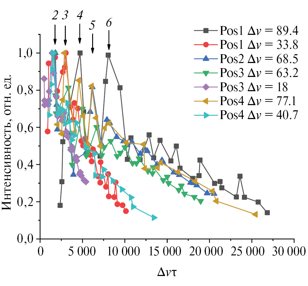Рис. 4. Интенсивности МК-когерентностей нулевого порядка в зависимости от безразмерного параметра Δvτ объединенные на общей шкале для различных ориентаций кристалла.