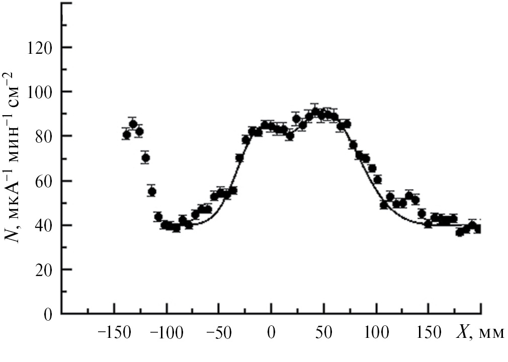 На рис. 1 показано экспериментальное распределение нейтронов вдоль горизонтальной оси, измеренное 10B-детектором в отсутствии кадмиевого фильтра. Он располагался на расстоянии 204 см от центра мишени. На рис. 2 показано экспериментальное распределение нейтронов, измеренное с помощью ПЧДН с кадмиевым фильтром перед ним. Его граничная энергия составляет около 0.55 эВ, то есть он задерживает тепловые нейтроны. На рис. 3 показано измеренное с помощью ПЧДН экспериментальное распределение нейтронов, которое соответствует разности между потоком нейтронов всех энергий и потоком нейтронов только промежуточных энергий. Поэтому это есть распределение только тепловых нейтронов с энергией ниже 0.55 эВ. Одновременно с измерением распределения нейтронов с помощью ПЧДН распределение нейтронов измерялось и с помощью перемещаемого механически вдоль горизонтальной плоскости 3He-счетчика. При установленном кадмиевом фильтре 3He-счетчик, который располагался позади ПЧДН, почти не регистрировал нейтронов. Это связано с тем, что эффективность 3He-счетчика для промежуточных и быстрых нейтронов очень мала. В эксперименте записывалась осциллограмма сигналов, вместе с которыми записывалось геометрическое положение счетчика. Из осциллограммы принимались в рассмотрение только тепловые нейтроны с энергией менее 0.5 эВ. На рис. 4 показано измеренное с помощью перемещаемого 3He-счетчика экспериментальное распределение нейтронов. Распределение потока нейтронов, измеренное с помощью ПЧДН и 3He-счетчика, находилось в согласии друг с другом с учетом различного пространственного разрешения.