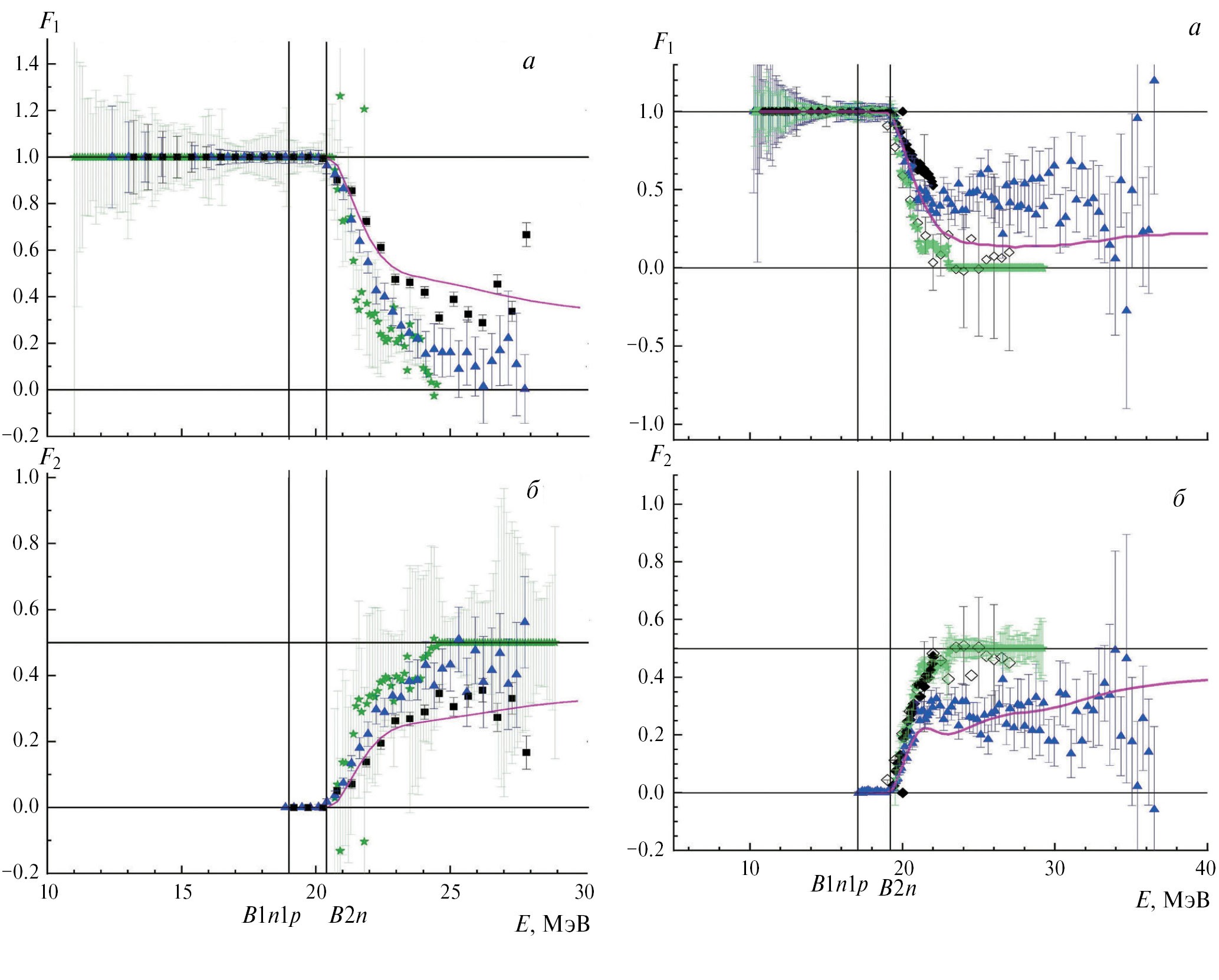 Рис. 2. Сравнение отношений F1 (а) и F2 (б), полученных с использованием экспериментальных и теоретических данных. Справа: ядро 51V, звезды — [9], треугольники — [12], квадраты — [14], линия — [13]. Слева: ядро 59Co, звезды — [9], треугольники — [4], заполненные ромбы — [10], пустые ромбы — [11], линия — [13].