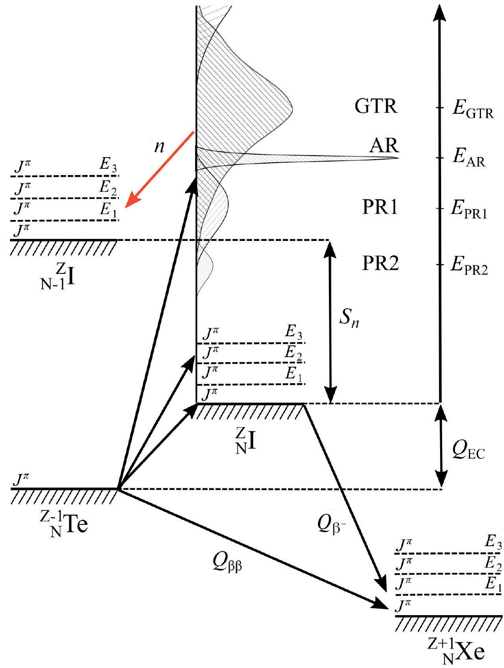 На рис. 1 дана объединенная схема возбужденных изобарических состояний изотопов 128Те и 130Те, которые наблюдаются в соседних ядрах 128, 130I. Для 128I при энергиях возбуждения, превышающих Sn = 6826.13 ± 5 кэВ [23], происходит распад в стабильное ядро 127I вместе с эмиссией нейтрона. При более низких энергиях возбуждения вначале идут переходы из возбужденного состояния ядра 128I в основное состояние, а затем бета-распад 128I из основного состояния в основное и возбужденные состояния ядра 128Хе. Аналогично и для ядра 130Те: распад в 129I с эмиссией нейтрона при энергии возбуждения больше Sn = 6500.33 ± 4 кэВ [23] или же бета-распад из основного состояния ядра 130I в основное и возбужденные состояния ядра 130Хе после того как распадутся в основное состояние 130I все возбуждения с энергиями Ex < Sn. Следует заметить, что поскольку бета-распад происходит в высоковозбужденные состояния ксенона, которые быстро распадаются, испуская γ-кванты, доля переходов, которые заселяют область энергии вблизи конечной точки для 0νββ распада 130I относительно велика и эти γ-кванты могут служить фоновым процессом в соответствующих экспериментах.
