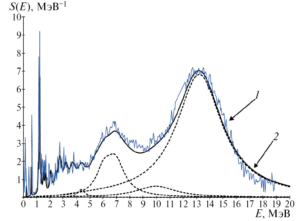 При описании как экспериментальных, так и расчетных данных по силовой функции S(E) изотопов 128, 130Те, существенный вопрос состоит в нормировке S(E). В расчетах использовалась нормировка ТКФС равная 81 % от максимального значения 3(N – Z), как в [36, 37]. На рис. 2 и рис. 3 для изотопов 128Те и 130Те представлено сравнение расчетной силовой функции S(E) и силовой функции, полученной из обработки экспериментальных данных. Для гигантского гамов-теллеровского резонанса рассчитаны положения пиков: EGTR = 13.208 МэВ, EAR = 11.87 МэВ (предсказание [40]), для 128Te и EGTR = 13.900 МэВ, EAR = 12.48 МэВ (предсказание [40]), что согласуется с данными эксперимента. При энергиях возбуждения от 4 до 9 МэВ для обоих ядер в силовой функции доминирует вклад от пигми резонансов, далее с ростом энергии возбуждения наибольший вклад дает гамов–теллеровский резонанс.