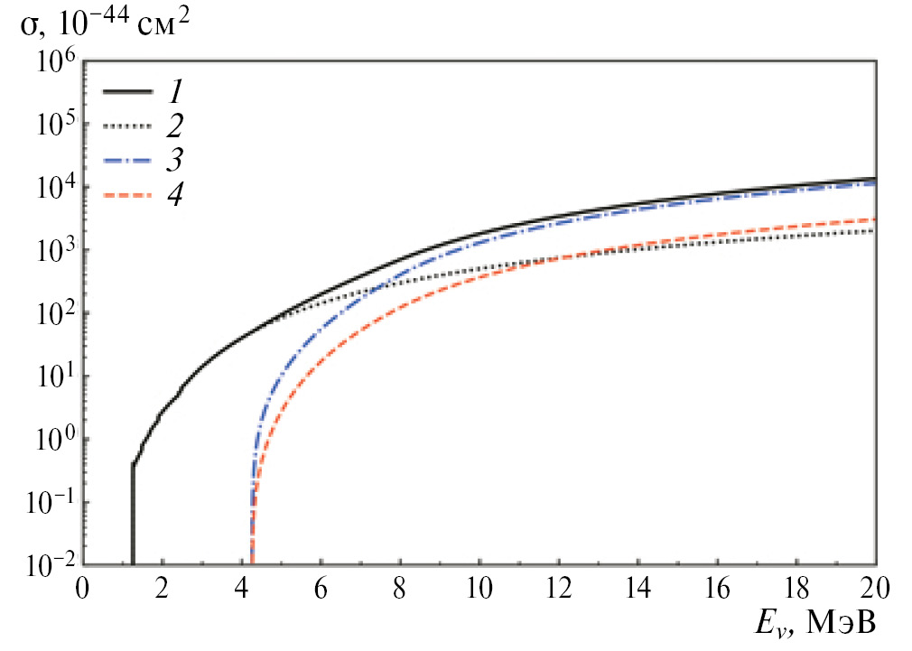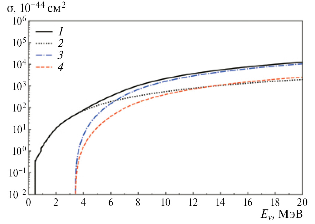 На рис. 4 и 5 представлены сечения захвата нейтрино в зависимости от энергии налетающего нейтрино для реакций 128Te(νe, e–)128I и 130Te(νe, e–)130I. На обоих рисунках видно, что, начиная от 6 МэВ вклад резонансной части силовой функции в полное сечение начинает доминировать над вкладом от низколежащих дискретных состояний. При этом так как S(E) была задана только до пороговой энергии отрыва нейтрона (Sn = 6826.13 ± 5 кэВ для 128I и Sn = 6500.33 ± 4 кэВ для 130I [23]), самыми заметными в ней будут вклады от PR резонансов, вклад от GTR резонанса будет в основном в виде подложки (см. рис. 2 и рис. 3). Из-за этого вклад GTR резонанса в сечение тоже будет занижен (линия 4 на рис. 4 и рис. 5).