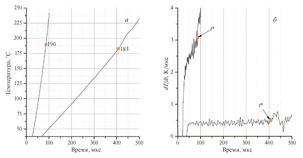 Рис. 1. Raw-files изменения температуры зонда T(t) (a) и ее производной по времени (б) в гексане при атмосферном давлении. Моменту вскипания t*, отмеченному стрелочкой, соответствует характерный излом зависимости dT(t)/dt.