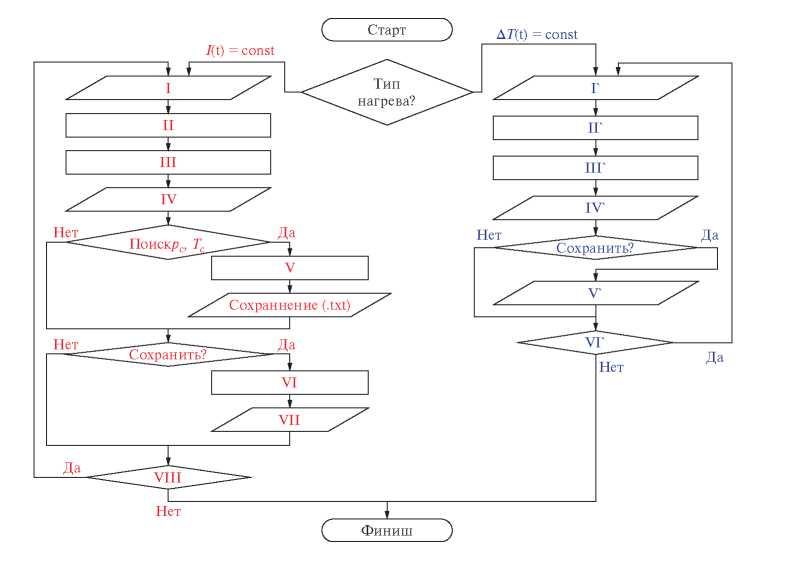 Старт: В зависимости от типа экспериментальных данных запускается либо блок для обработки данных с прямоугольным импульсом тока, либо блок для обработки данных температурного плато.