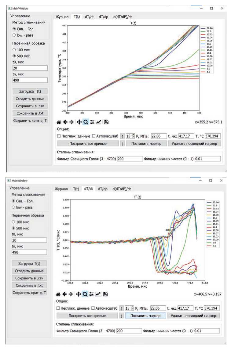 Рис. 3. Графический интерфейс ПО для определения ФД (линии достижимого перегрева и критических параметров) на примере воды: исходные данные термограмм (вверху), значения их производных по времени (внизу).