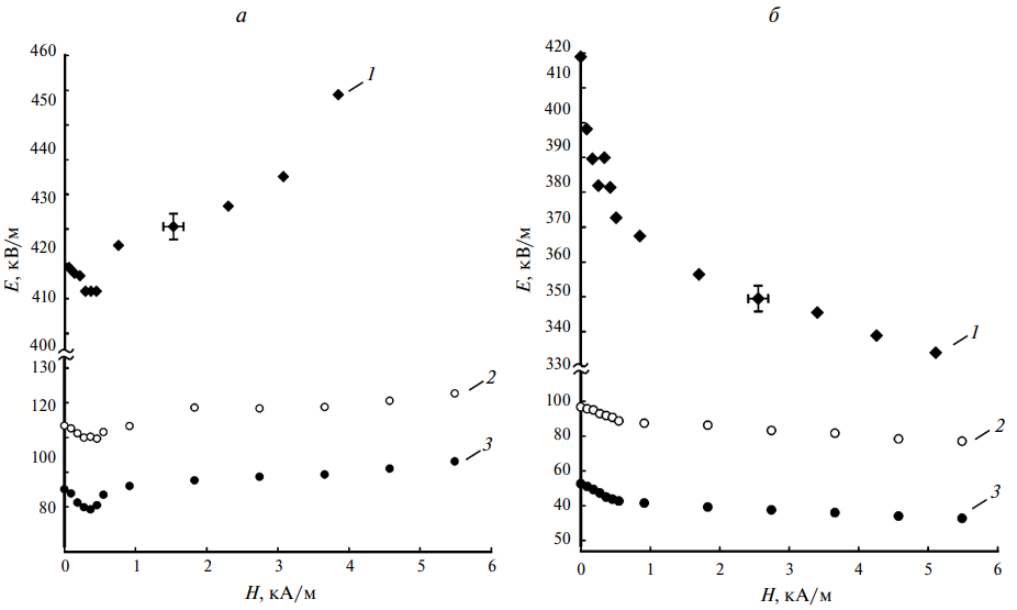 Величина EП, зависит от температуры, толщины слоя, проводимости образца, а также от дополнительного воздействия магнитного поля различной ориентации. Так, при повышении электропроводности образца, величина порогового значения напряженности электрического поля уменьшается, к аналогичному результату приводит также повышение температуры [14]. Вместе с тем, оказалось, что зависимость пороговой напряженности электрического поля от напряженности магнитного поля имеет более сложный характер, чем об этом сообщалось в предыдущих работах [12, 13]. В частности, в достаточно слабых магнитных полях (до 0.5 кА/м), направленных перпендикулярно вектору напряженности электрического поля, наблюдалось уменьшение порогового напряжения, тогда как при напряженности магнитного поля более 0.5 кА/м — зависимость EП носит возрастающий характер (рис. 2а). Если же магнитное поле сонаправлено с вектором напряженности электрического поля, то эта зависимость всегда имеет убывающий характер (рис. 2б).