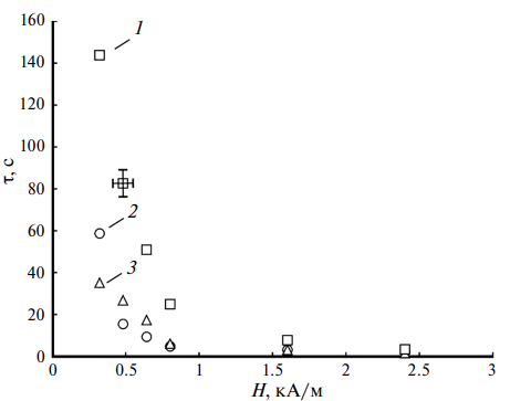 Рис. 5. Зависимость времени перестройки лабиринтной структуры в полосовую структуру от напряженности магнитного поля при различных значениях напряжения на электродах ячейки: 1—3.4 В, 2—2.8 В, 3—3 В, толщина слоя 20 мкм.