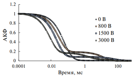 На рис. 1 представлены АКФ рассеянного света в магнитной жидкости под действием электрического поля небольшой напряженности (0.3 МВ/м) и в отсутствие поля. Анализ автокорреляционных функций показывает, что поля подобной величины способствуют росту агрегатов, размер которых может достигать 1—10 мкм. При этом интенсивность рассеянного магнитной жидкостью света возрастает. Изменение интенсивности рассеянного света может быть очень значительным и достигать 5—8 раз в полях до 0.5—0.7 МВ/м особенно в свежеразбавленных магнитных жидкостях, не подвергавшихся ранее воздействию электрического поля. Формы АКФ существенно меняются при повышении напряжения между электродами. На рис. 2 представлены автокорреляционные функции для различных напряжений при межэлектродном расстоянии 2 мм. Видно, что характерное время спада функции уменьшается примерно на порядок при увеличении напряжения до 3 кВ. Классическая интерпретация таких функций приводит к выводу об уменьшении характерного размера частиц до 1 нм и менее. Физически это представляется невероятным. Однако такой же эффект значительного уменьшения постоянной времени автокорреляционной функции можно объяснить и с других позиций. Уменьшение постоянной времени может быть связано с тем, что частицы магнитной жидкости помимо броуновского движения участвуют еще в одном достаточно быстром движении, также имеющем хаотический характер. Таким движением может быть электроконвекция, возникающая в жидких диэлектриках при достаточно высоких напряжениях между электродами.