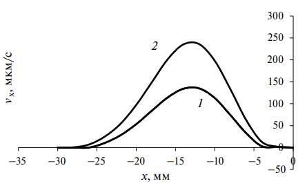 Рис. 2. Продольная компонента скорости νx в зависимости от координаты x рядом с тромбом (x = 0) для различных частот ω при фиксированном z = l / 3. Кривая 1: ω = 10 c−1; кривая 2: ω = 20 c−1. Объемная концентрация частиц в центре капли Φ0 = 0.01; дисперсия σ=1 см; характеристики магнита одинаковы для всех остальных: диаметр D=1см; ток I=8 А; высота h=1 см; количество витков N= 104; положение центра облака x0 = 1 мм, ширина канала l = 2 мм