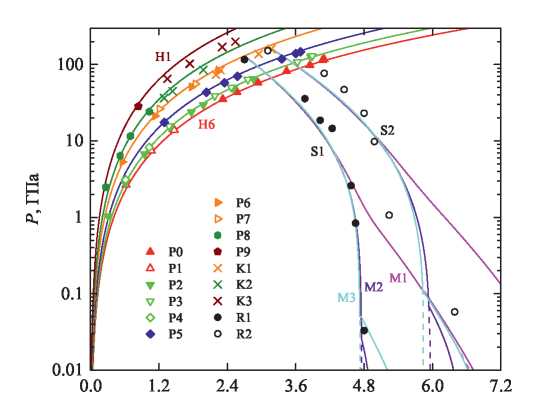 Рис. 3. Ударные адиабаты (H1–H6) и изоэнтропы разгрузки (S1 и S2) для образцов вольфрама с исходной плотностью ρ00 = 4.60 (H1), 5.50, 6.64, 8.87 (S1, S2), 10.59 и 13.36 г∙см−3 ρ00 = 13.36 (H1), 10.59, 8.87 (S1, S2), 6.64, 5.50, и 4.60 г∙см−3 (H6); маркеры – экспериментальные данные (P0, P3, P5, P6, P9, K3 – [29]; P1, P5 – [30]; P2, P8, K2 – [28]; P7, K1 – [27]; R1, R2 – [31]), из которых часть (K1, K2, K3) выходят за пределы области V > b. Изоэнтропы S1 и S2 соответствуют массовой скорости на ударной адиабате U = 2.7 и 3.11 км∙с−1; лиловые, фиолетовые и голубые линии – результаты расчетов изоэнтроп по моделям M1, M2 и M3 соответственно с учетом образования двухфазной смеси жидкость–пар (сплошные линии) и метастабильных однофазных состояний (штриховые линии).
