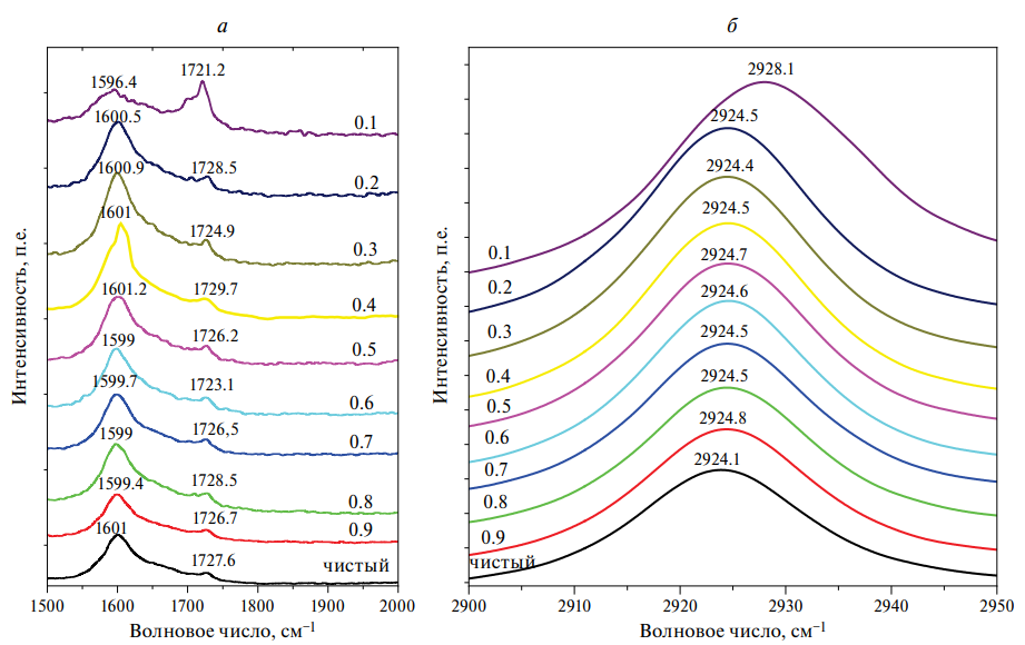 Обратим внимание на валентные полосы C=O и C-H, которые активно участвуют в межмолекулярном взаимодействии и хорошо представлены в колебательных спектрах. Ацетилацетон имеет две группы С=О, которые дают в спектрах две колебательные полосы: это симметричные и асимметричные валентные колебания (рис. 2). Причем в чистом состоянии максимумы этих полос приходятся на 1601 и 1727.6 см-1 с полушириной 46.2 см-1. Такое большое значение полуширины может быть результатом перекрытия двух колебательных полос С=О ацетилацетона. При рассмотрении водного раствора ацетилацетона с протон донорными свойствами (рис. 2а) максимум полосы спектра начинает смещаться в сторону более низких частот при количестве ацетилацетона в растворе 0.9 мольных долей (м. д.), а полуширина спектральной полосы, соответствующей асимметричному колебанию, увеличивается на 3.7 см-1. Это смещение продолжается до количества ацетилацетона 0.1 м. д.. При наименьшем количестве ацетилацетона в растворе увеличивается интенсивность и высокочастотная асимметрия полосы. Точно так же максимум спектральной полосы смещается в сторону более низких частот по мере уменьшения процентного содержания ацетилацетона. При 0.1 м. д. эта частота составляет 1721.2 см-1 (полуширина 22.8 см-1), и по сравнению с чистым состоянием наблюдается красное смещение на 6.4 см-1. С уменьшением концентрации полуширина увеличивается. Появление такой широкой полосы и причина сдвигов связаны с образованием водородных связей в форме С=О…Н между атомами кислорода в группах С=О ацетилацетона и атомами водорода молекулы воды.