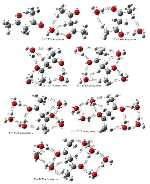Рис. 3. Оптимальная геометрия ацетилацетона и его комплексов с водой.