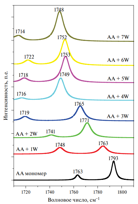 В связи с наличием двух (симметричного и антисимметричного) валентных колебаний группы С=О ацетилацетона в спектре мономера присутствуют две колебательные полосы С=О. Это 1763 и 1793 см-1 соответственно, а при добавлении одной молекулы воды к ацетилацетону для этих колебательных полос наблюдались красные смещения (15 и 30 см-1 соответственно). По мере увеличения количества молекул воды смещение к более низкой частоте увеличивалось. Когда число молекул воды достигает семи, эти антисимметричные и симметричные колебательные полосы наблюдаются при 1714 и 1748 см-1 соответственно и сдвинуты на 49 и 45 см-1 по сравнению с мономером. Этот факт еще раз подтверждает наличие красного смещения в экспериментальных результатах. Эти результаты наблюдались и в нашей предыдущей работе [1, 34].