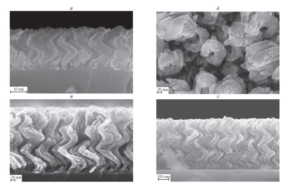 Рис. 1. Микроскопические изображения наноструктурированных пленок Co/Si, полученных при разных скоростях вращения подложки: 0.3 об/мин – поперечный срез (а) и вид сверху (б), 0.6 об/мин – поперечный срез (в), 1.6 об/мин – поперечный срез (г).