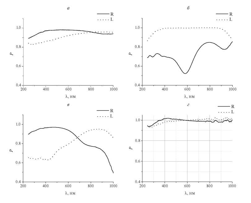 Рис. 2. Зависимости степени поляризации отраженной волны от длины волны используемого излучения для двух видов падающих циркулярно-поляризованных волн (правой-R и левой-L) для образцов с разными скоростями вращения: 0.2 (а), 0.3 (б), 0.6 (в) и 1.6 об/мин (г).