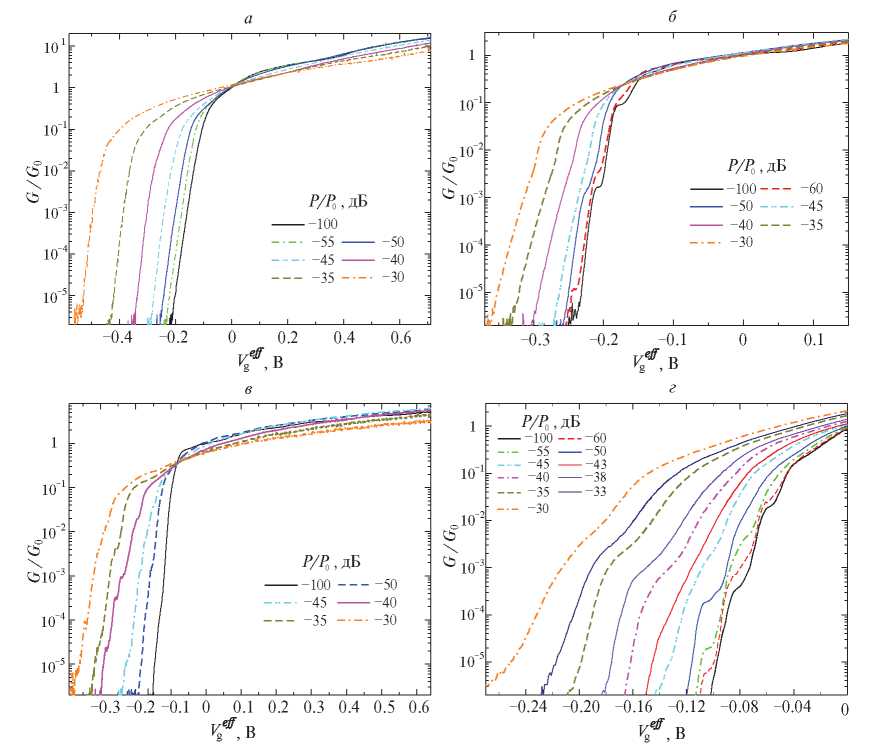 Измеренные зависимости G(Vg, P) коротких КТК при 4.2 К представлены на рис. 2. для некоторых образцов в трех упомянутых типах гетероструктур. Независимой переменной на данном рисунке служит величина Vgeff = Vg – Vg (G0, P = 0), что удобно из-за чувствительности кондактанса к деталям формирования КТК. Кондактанс приводится в логарифмическом масштабе, а отношение мощности на выходе из генератора микроволн P к максимальной величине P0 = 1Вт дается в децибелах. Интервал показа кондактанса охватывает туннельный режим и существенную часть открытого режима КТК: G ≥ 0.5G0 при P = 0. Из рис. 2 видна основная тенденция в поведении изученных образцов: в туннельном режиме кондактанс зависит от Vg экспоненциально, увеличиваясь на порядки с ростом P от P = 0 (–100 дБ) до P = 1 мВт (–30 дБ). Относительная величина фотокондактанса G(P)–G (P = 0) в глубоком туннельном режиме является гигантской при P = 1 мВт. На выходе из туннельного режима при G ~ 0.5G0 зависимость logG(Vg, P) существенно ослабляется. Анализируя рис. 2 легко заметить, что кроме основной тенденции на показанных зависимостях есть детали, которые при G > 0.2G0 лучше были бы видны в линейном масштабе [41, 42]. Речь идет о предсказанном в [3] линейном росте кондактанса в открытом режиме короткого КТК, а также об изломе при (0.5–0.7) G0, который обычно присутствует на измеренных G(Vg) не только в типичных [4–11], но и в коротких [35, 38, 41, 42] КТК. В логарифмическом масштабе кондактанса этот излом заметен при P → 0 для КТК в гетероструктурах типа 1 и 2 (рис. 2б и 2в). Интересно, что в ожидаемом месте его нет в случае образца в гетероструктуре типа 3 (рис. 2а и 2г), но в туннельном режиме при разном охлаждении этого образца форма кривых G(Vg) оказалось довольно разной. Это простые экспоненты на рис. 2а при G ≤ 0.1G0, но в том же диапазоне кондактанса все кривые на рис. 2г имеют плечеподобные особенности. В случаях КТК в гетероструктурах типа 1 и 2 резкие ступеньки обнаружены в туннельном режиме на нескольких кривых при P ≤ 0.01 мВт (рис. 2б) и при P ~ 0.1 мВт (рис. 2в). Их высота повышается с ростом P при сохранении положения ступеней по Vg. Поскольку картина ступеней индивидуальна для каждого образца и процедуры охлаждения, то ступени есть результат влияния на кондактанс замороженных случайных расположений локализованных зарядов в Si-δ-легированных слоях. Как видно из рис. 2, относительное изменение кондактанса с ростом P при переходе в открытый режим становится гораздо меньше, чем в глубоком туннельном режиме, например в открытом режиме фотокондактанс G(P)–G (P = 0) слабо (и медленно по Vg) колеблется, меняя свой знак (рис. 2б). Однако при другом охлаждении того же самого образца в гетероструктуре типа 1 фотокондактанс был положительным везде в туннельном и открытом режимах КТК [42]. Напротив, фотокондактанс в открытом режиме на рис. 2а в является отрицательным, приближаясь по модулю к G0, когда G(Vg)/G0 при P = 0 становится гораздо больше единицы [41]. При этом есть своего рода критическая точка: смена знака фотокондактанса происходит независимо от P приблизительно при одном и том же значении кондактанса, но на рис. 2a эта точка лежит выше G0, а на рис. 2в ниже 0.5G0.
