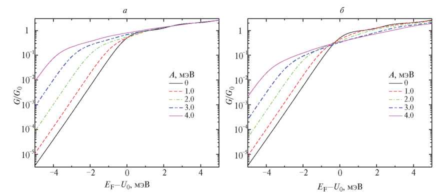 Рис. 3. Зависимости G(EF–U0, A) для T = 0 в квазиодномерной модели транспорта через идеализированный КТК для двух разных значений параметра δV : δV = 0; (а) 0 < δV ≈ V (б) (синфазные высокочастотные колебания напряжения между потенциометрическими контактами и потенциального барьера под затвором относительно EF).