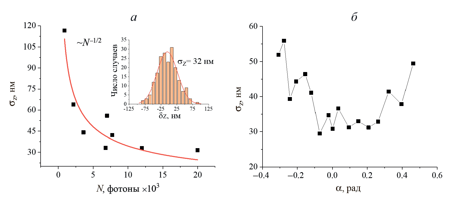 Точность определения продольной координаты точечного источника σz (среднеквадратичное отклонение) оценивалось из распределения продольных координат z, измеренных при фиксированном положении точечного излучателя. Методика подробно описана в [24]. На вставке к рис. 4а приведен пример распределения восстановленных продольных координат z, полученный в серии измерений = 200 и его аппроксимация функцией Гаусса. Для оценки точности восстановления координат были проведены эксперименты двух типов. В первом — измерялась зависимость точности σz(N) от числа фотонов люминесценции N, давших вклад в изображение. В этих экспериментах положение точечного излучателя относительно фокальной плоскости микроскопа z было фиксированным. Во втором типе исследовалась точность σz(α) от угла поворота изображения α при фиксированном числе фотонов N. Оценка числа фотоотсчетов в двулепестковых изображениях проводилась с помощью метода, описанного в работе [36], пересчет фотоотсчетов в число фотонов N проводился с учетом коэффициента усиления ПЗС камеры [37].