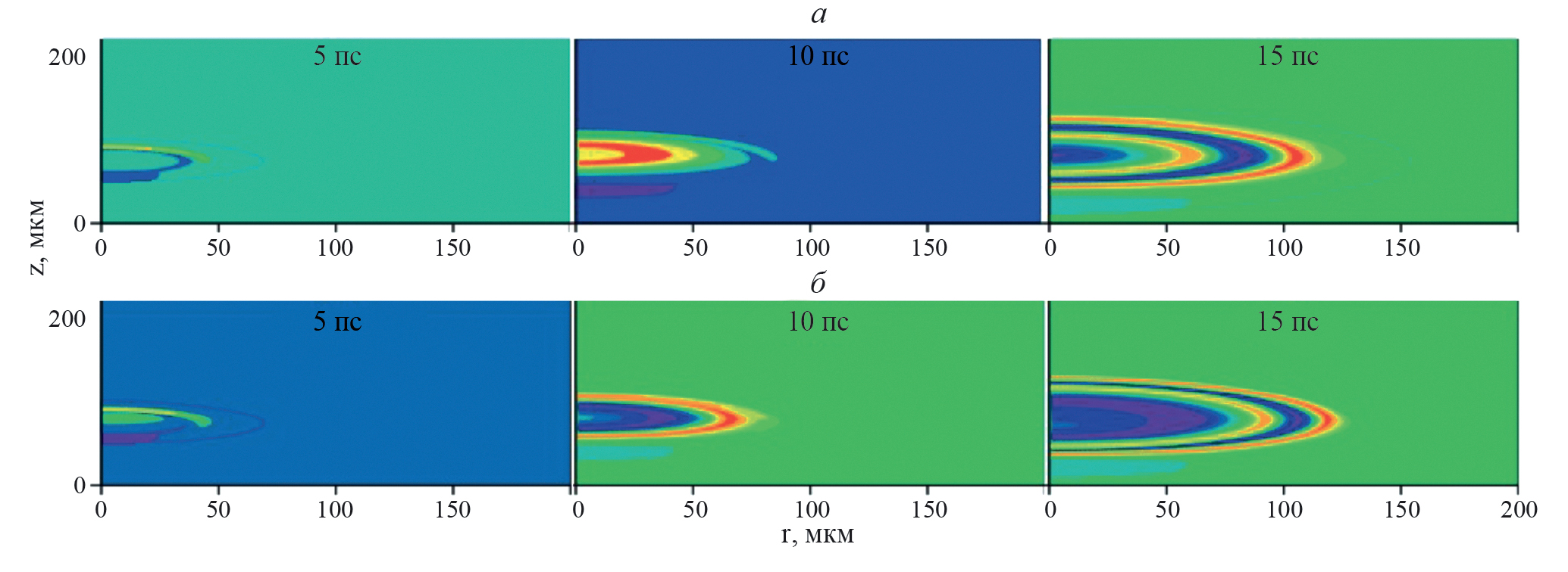 Рис. 1. Эволюция плотности тока в фотонном кристалле с примесными УНТ под действием лазерного импульса в фиксированные момент времени (а). Продольные срезы плотности тока (б).