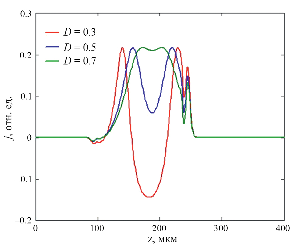 Рис. 4. Продольные срезы плотности тока, в момент времени 10 пс, для различных значений параметра D.
