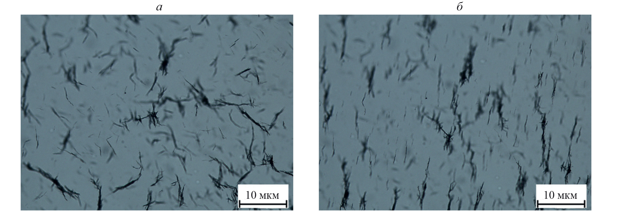 Рис. 1. Фотографии ориентации агрегатов FeNi СНЧ в дистиллированной воде в оптическом микроскопе Nikon Eclipse LV100: без внешнего магнитного поля (а), при воздействии магнитного поля (б).